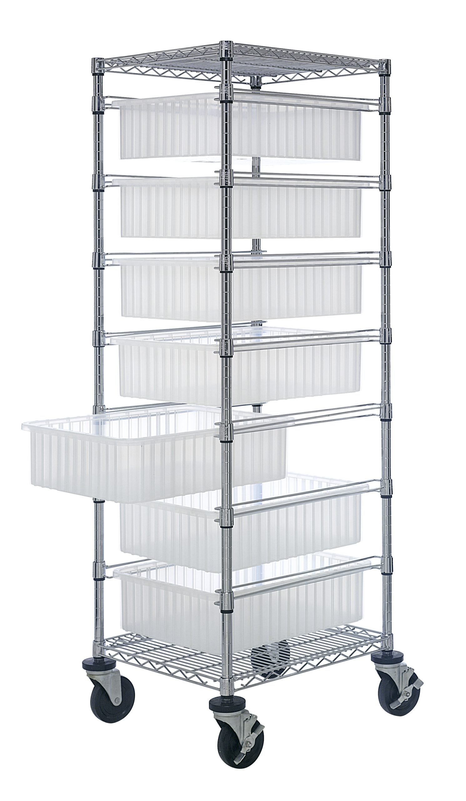 Quantum Bin Cart, Mobile, 21″W X 24″L X 69″H, Includes: (2) Wire Shelves, (7) 22-1/2″L X 17-1/2″W X 6″H (DG93060) Clear Bin And Set Of Casters, Chrome Plated Finish