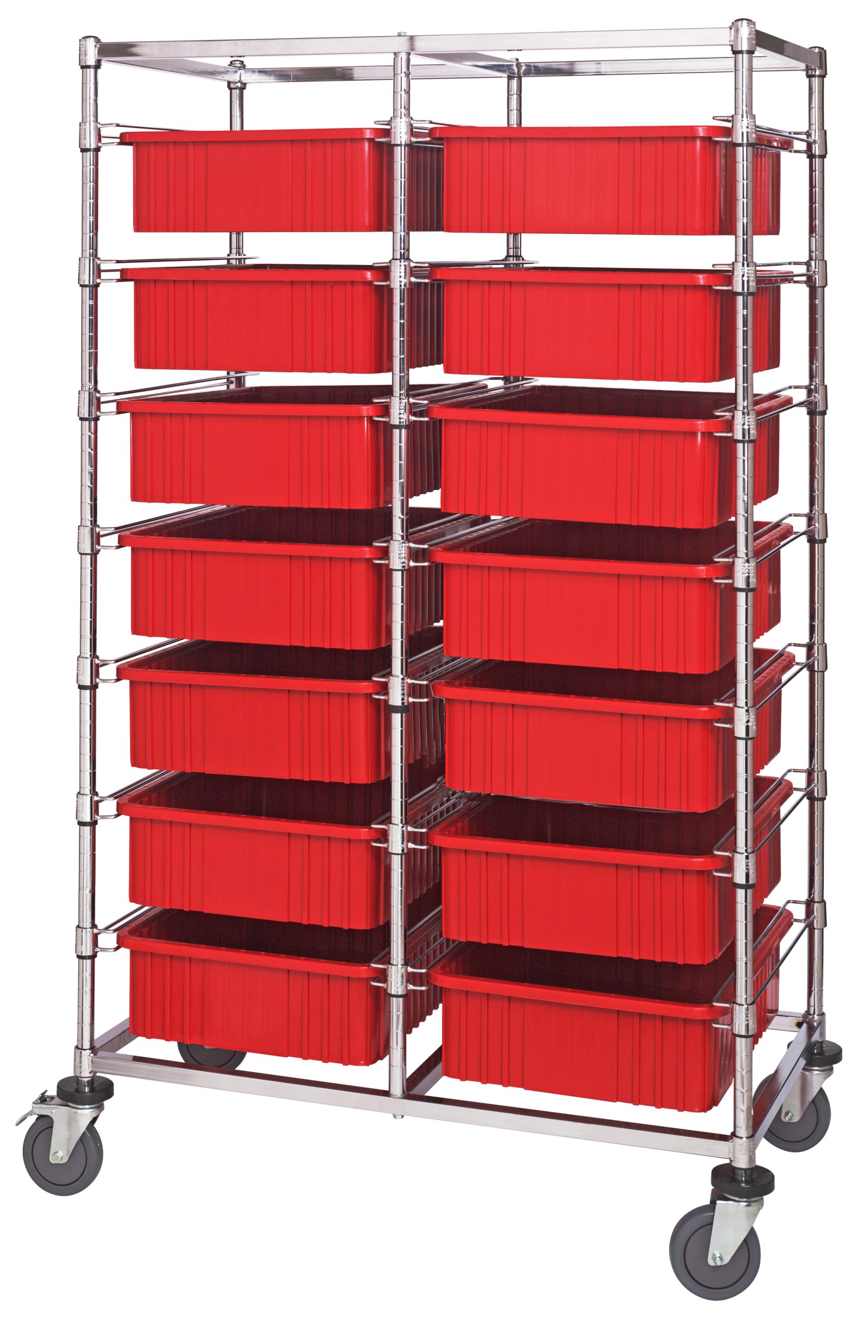 Quantum Bin Cart, Mobile, Double Bay, 24″W X 40″L X 69″H, Includes: (14) 22-1/2″L X 17-1/2″W X 6″H (DG93060) Red Bin, Chrome Plated Finish, Shipped Kd