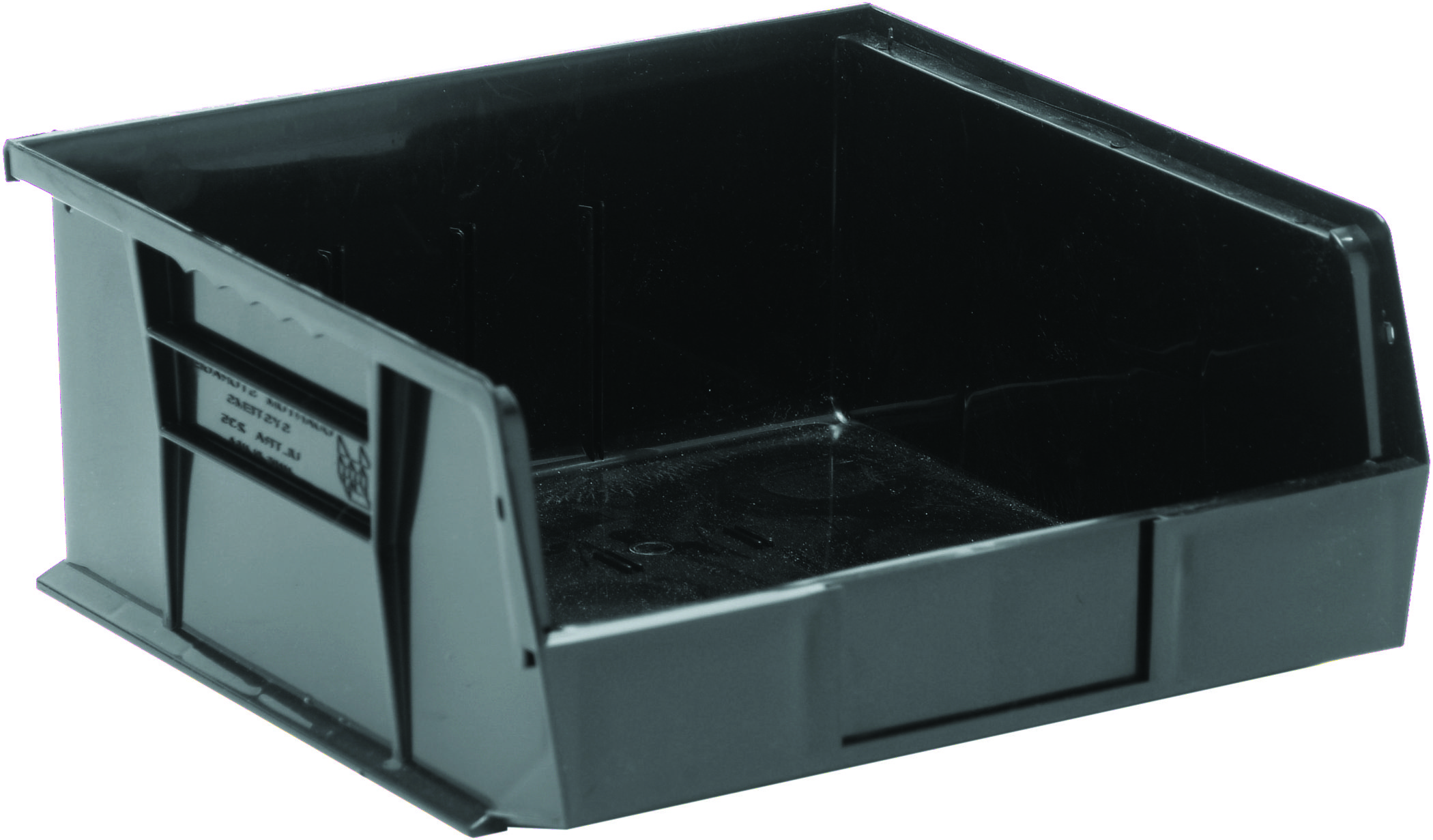 Quantum Bin, Stacking Or Hanging, 11″W X 10-7/8″D X 5″H, Front/Back/Side Grips, Anti-Slide Lock, (3) Divider Slot, Rear Hanger, Molded-In Label Holder, Polypropylene, Black, Made In USA