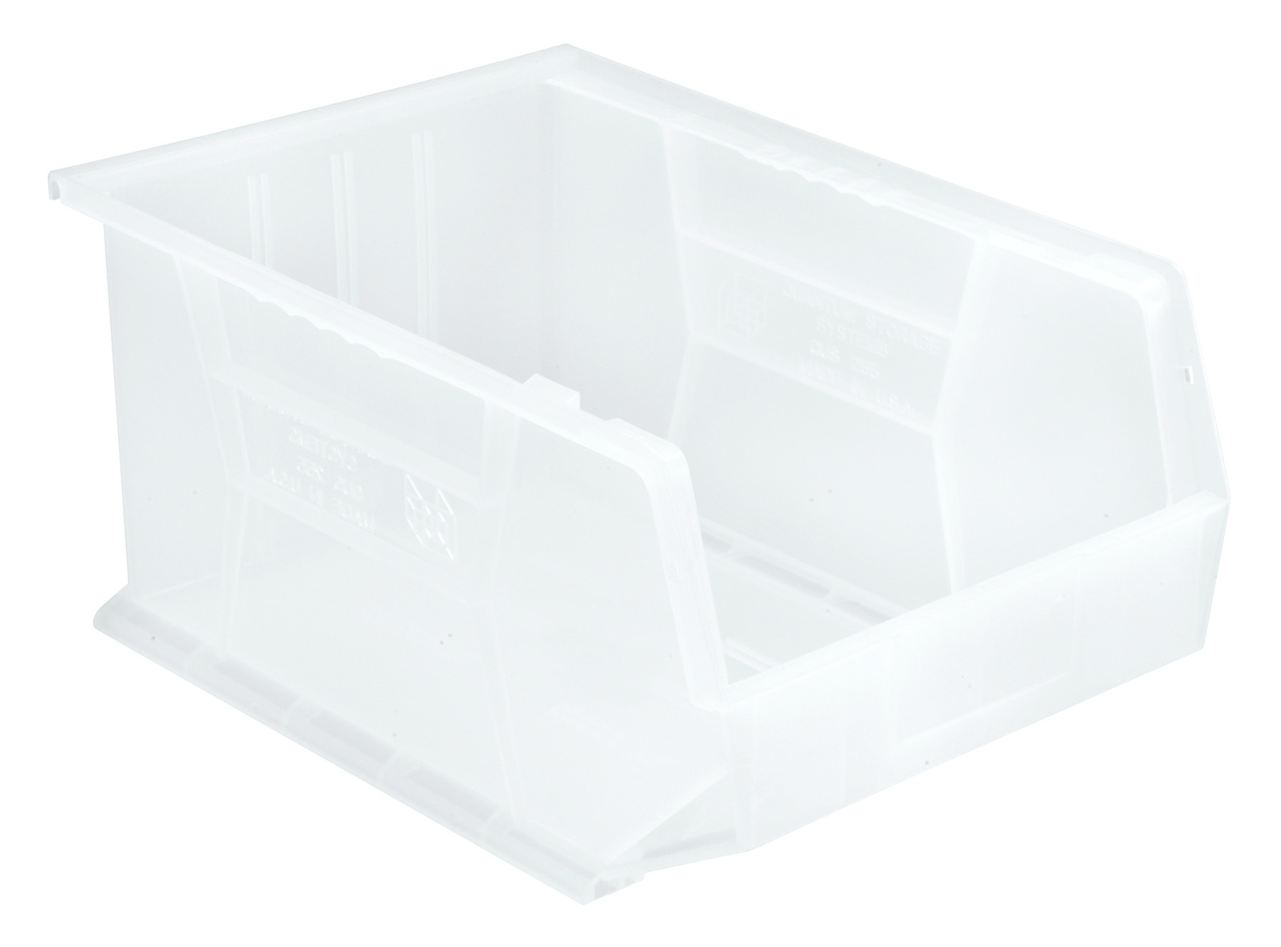 Quantum Bin, Stacking Or Hanging, 11″W X 16″D X 8″H, Front/Back/Side Grips, Anti-Slide Lock, (3) Divider Slots, Rear Hanger, Molded-In Label Holder, Polypropylene, Clear, Made In USA