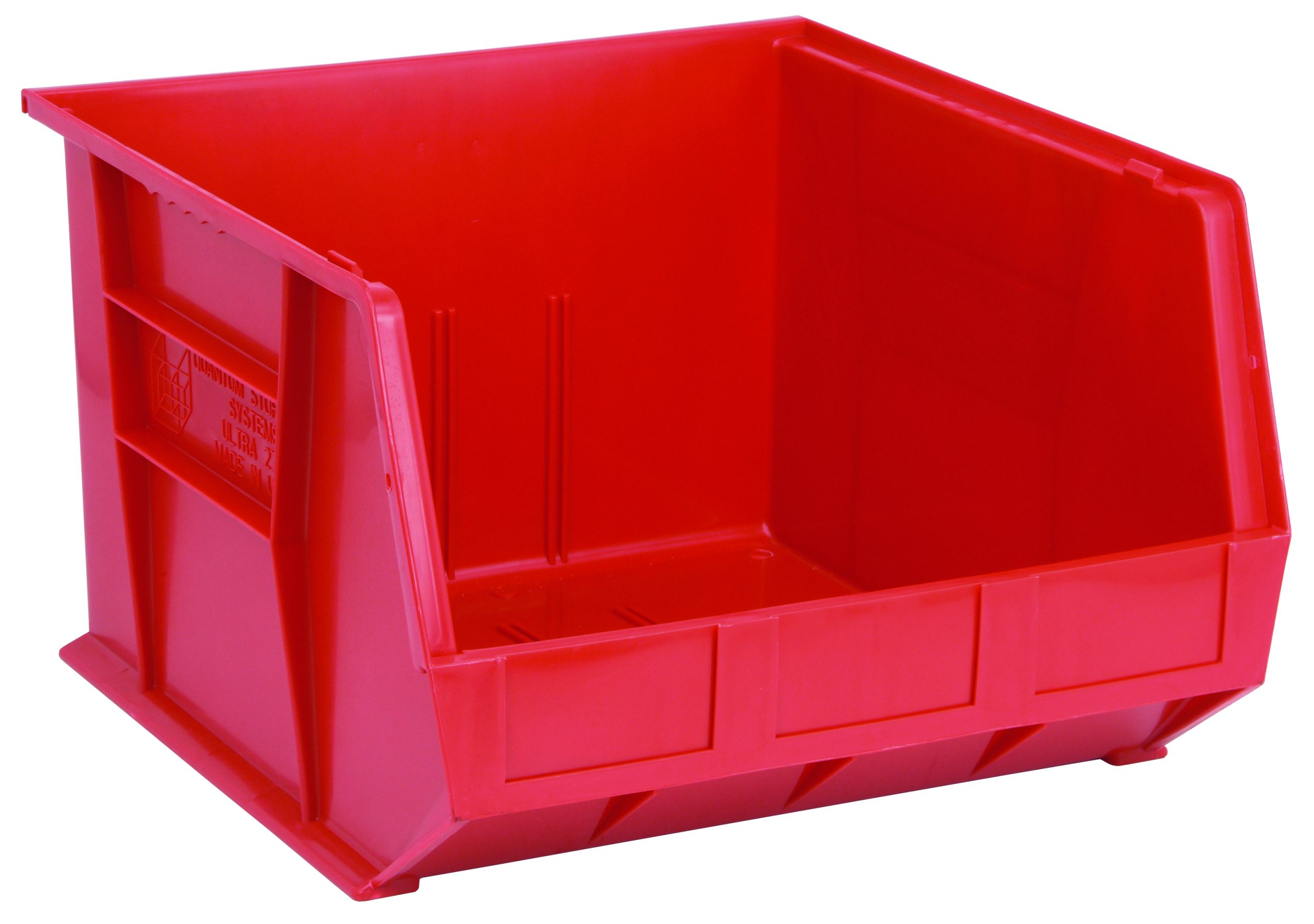 Quantum Bin, Stacking Or Hanging, 16-1/2″W X 18″D X 11″H, Front/Back/Side Grips, Anti-Slide Lock, (3) Divider Slot, Rear Hanger, Molded-In Label Holder, Polypropylene, Red, Made In USA