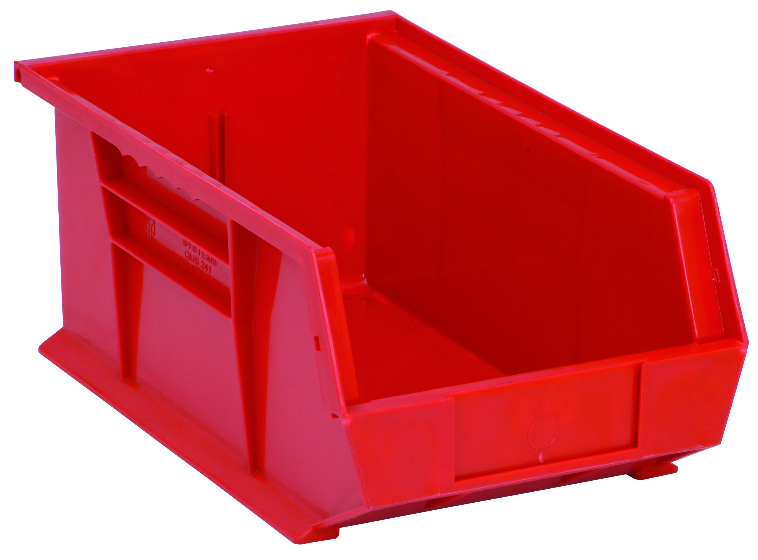 Quantum Bin, Stacking Or Hanging, 8-1/4″W X 13-5/8″D X 6″H, Front/Back/Side Grips, Anti-Slide Lock, (1) Divider Slot, Rear Hanger, Molded-In Label Holder, Polypropylene, Red, Made In USA
