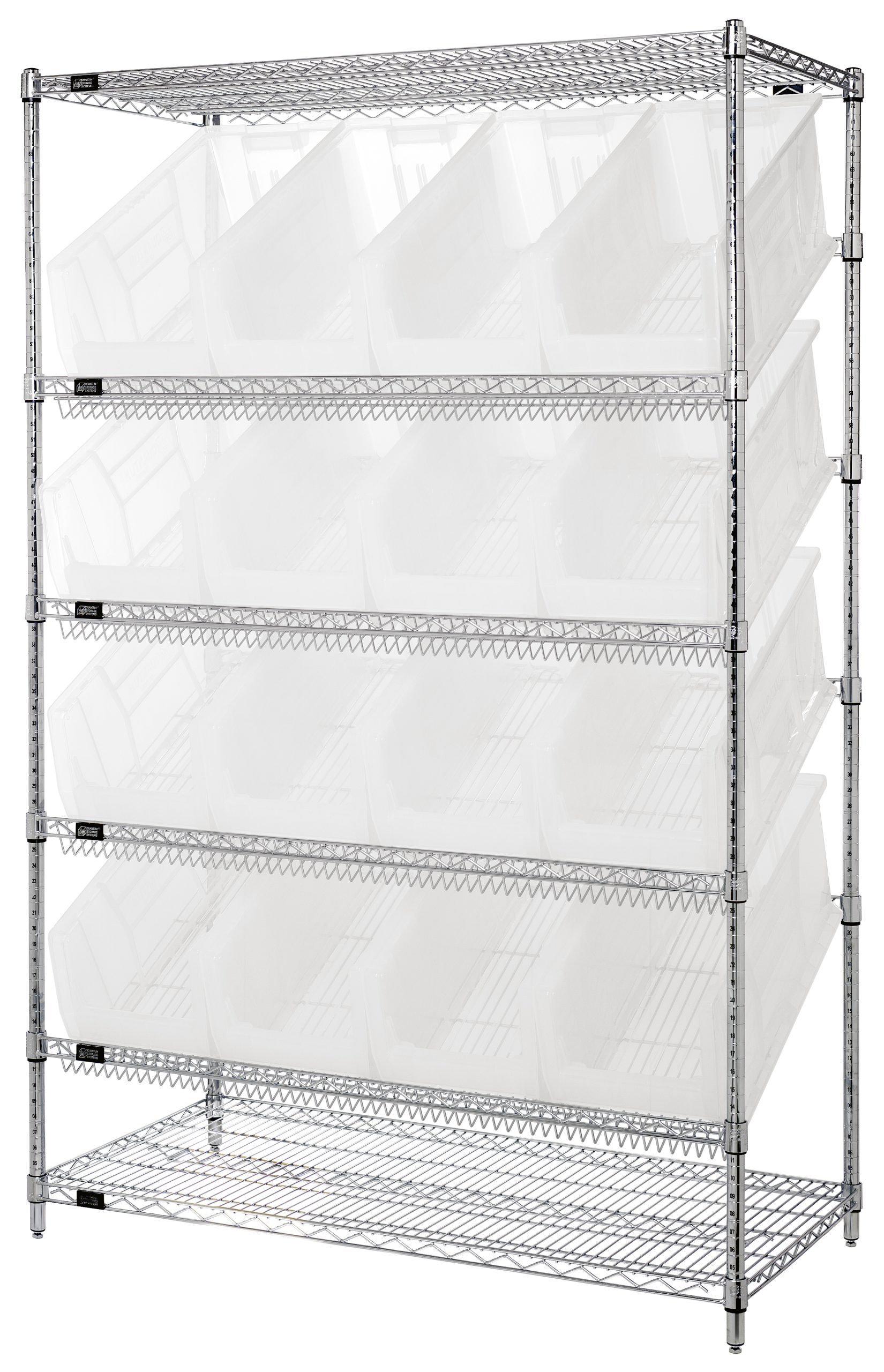 Quantum Bin System Unit, Stationary, 24″W X 48″L X 74″H, 800 Lbs Capacity Per Shelf, Includes: (2) Flat And (4) Slanted Shelves, (4) Posts And (16) QUS953 Clear Bins, Chrome Plated Finish, Shipped Kd