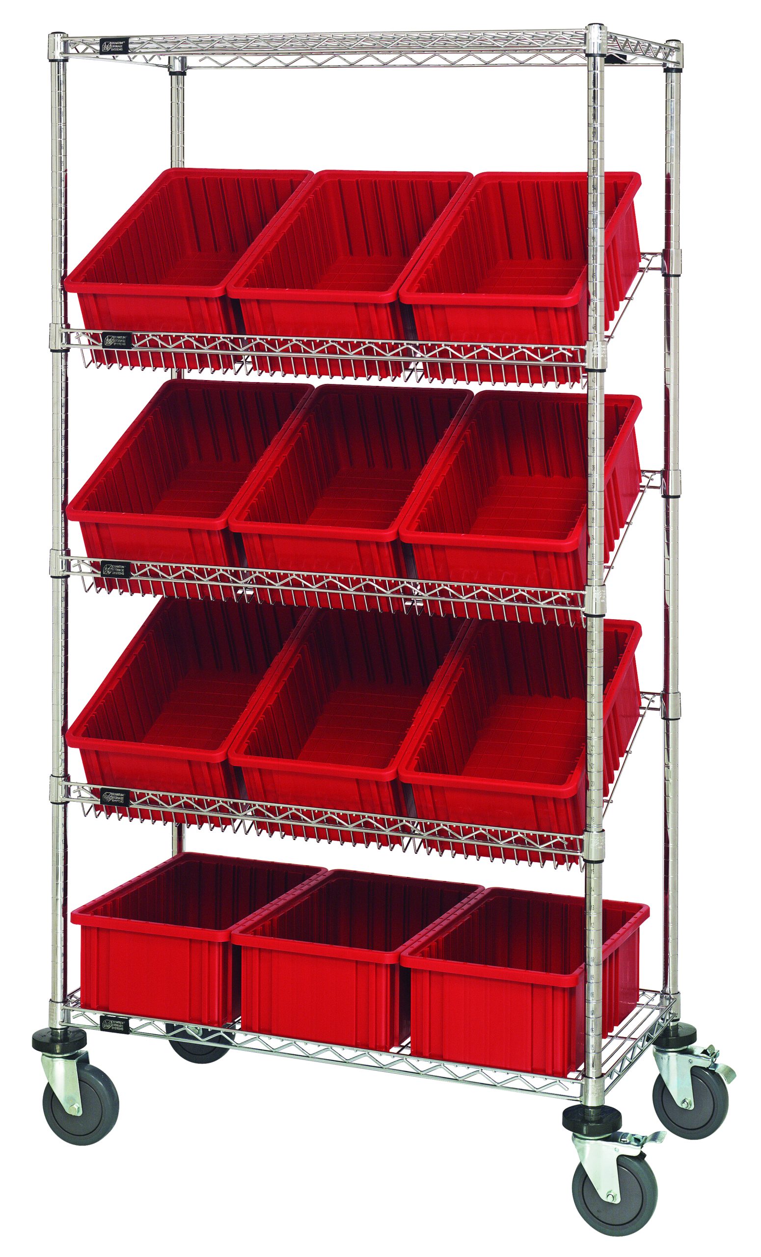 Bin Systems Unit, mobile, 36″L x 18″W x 69″H, includes: (4) posts, (2) flat wire shelves, (3) slanted wire shelves, (12) 16-1/2″L x 10-7/8″W x 6″H red bins (DG92060) & (4) 5″ swivel polyurethane casters (2 with brakes), red, chrome plated finish, suitable for dry storage applications, shipped KD