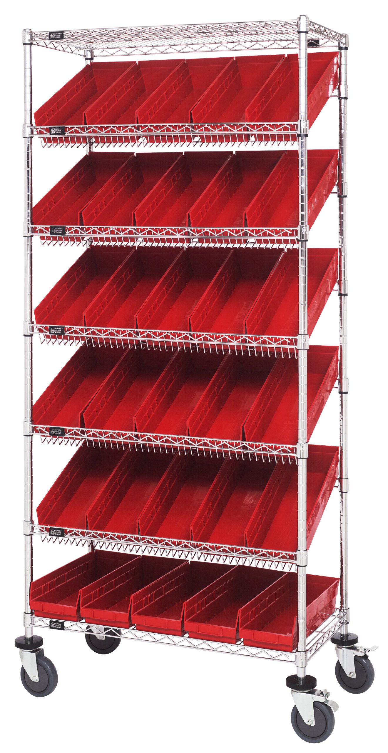 Quantum Bin Systems Unit, Mobile, 36″L X 18″W X 80″H, Includes: (4) Posts, (2) Flat Wire Shelves, (5) Slanted Wire Shelves, (30) 17-7/8″L X 6-5/8″W X 4″H Red Bins (Qsb104) & (4) 5″ Swivel Polyurethane Casters (2 With Brakes), Chrome Plated Finish, Suitable For Dry Storage Applications, Shipped Kd