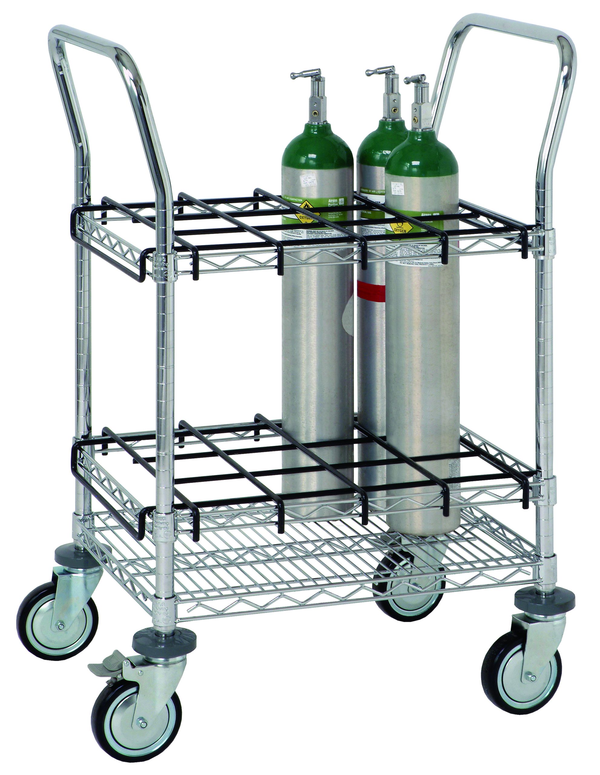 Cylinder Transport/Inhalation Therapy Cart, 24″W x 18″D x 37-1/2″H, can support up to 12 of the D and/or E cylinders, chrome plated finish