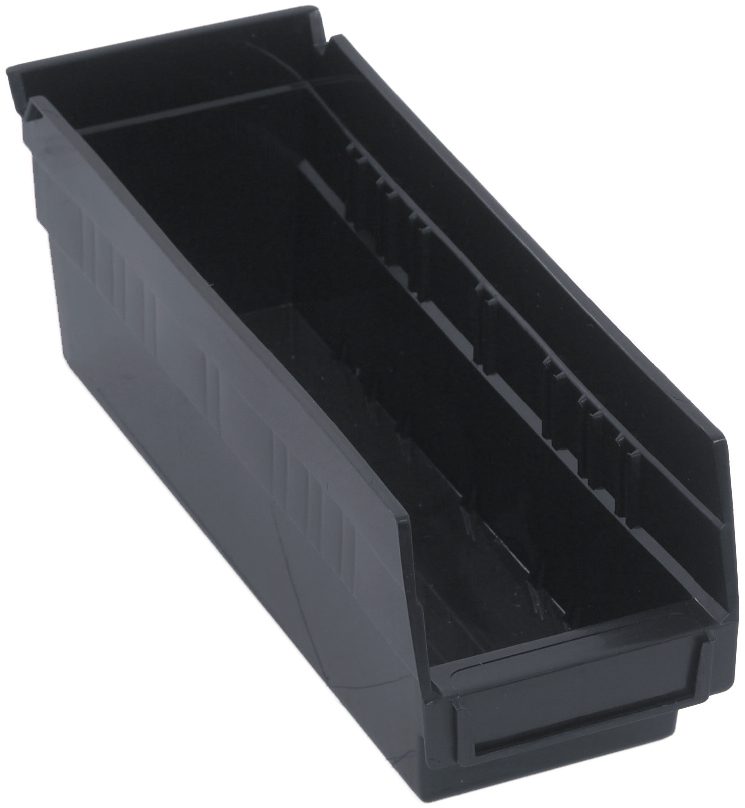 Economy shelf bin, 11-5/8″W x 4-1/8″D x 4″H, includes (7) divider slots, rear hanglock, molded-in label holder, polypropylene, black, Made in USA