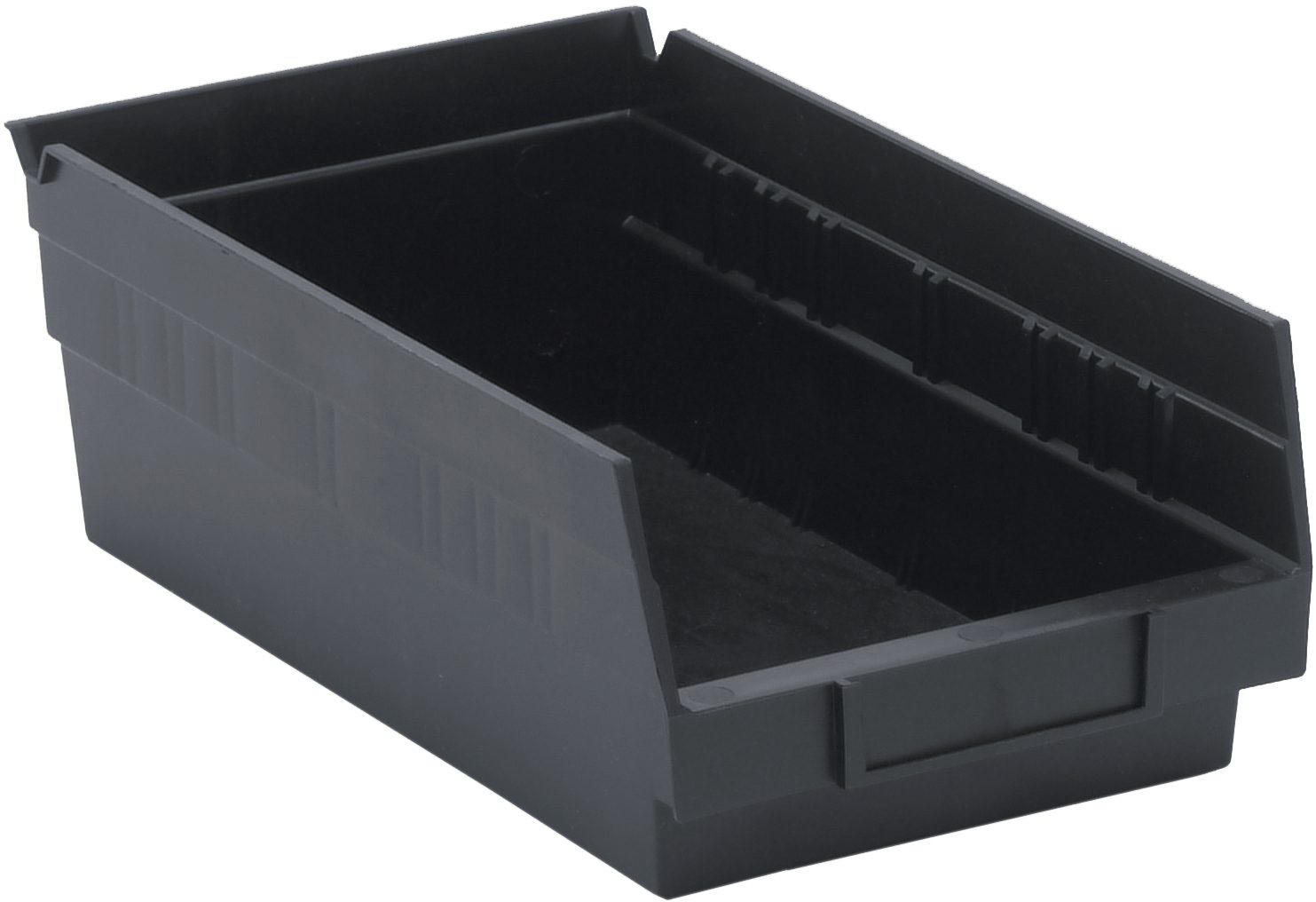 Economy shelf bin, 11-5/8″W x 6-5/8″D x 4″H, includes (7) divider slots, rear hanglock, molded-in label holder, polypropylene, black, Made in USA