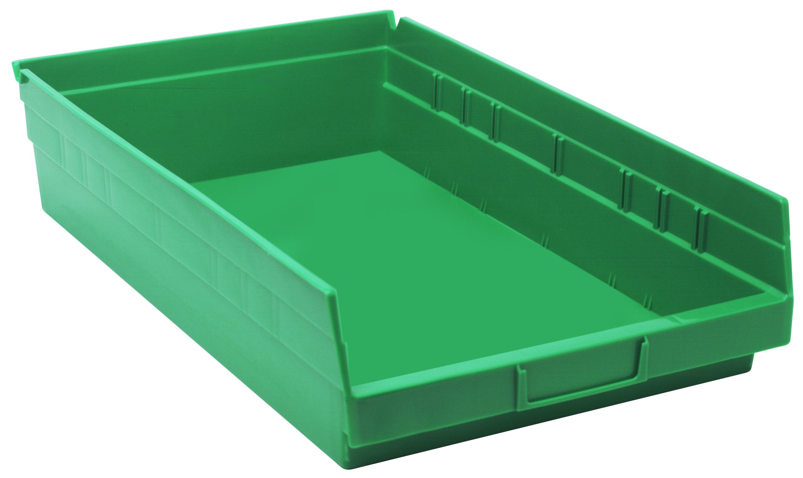 Economy shelf bin, 17-7/8″W x 11-1/8″D x 4″H, includes (7) divider slots, rear hanglock, molded-in label holder, polypropylene, green, Made in USA