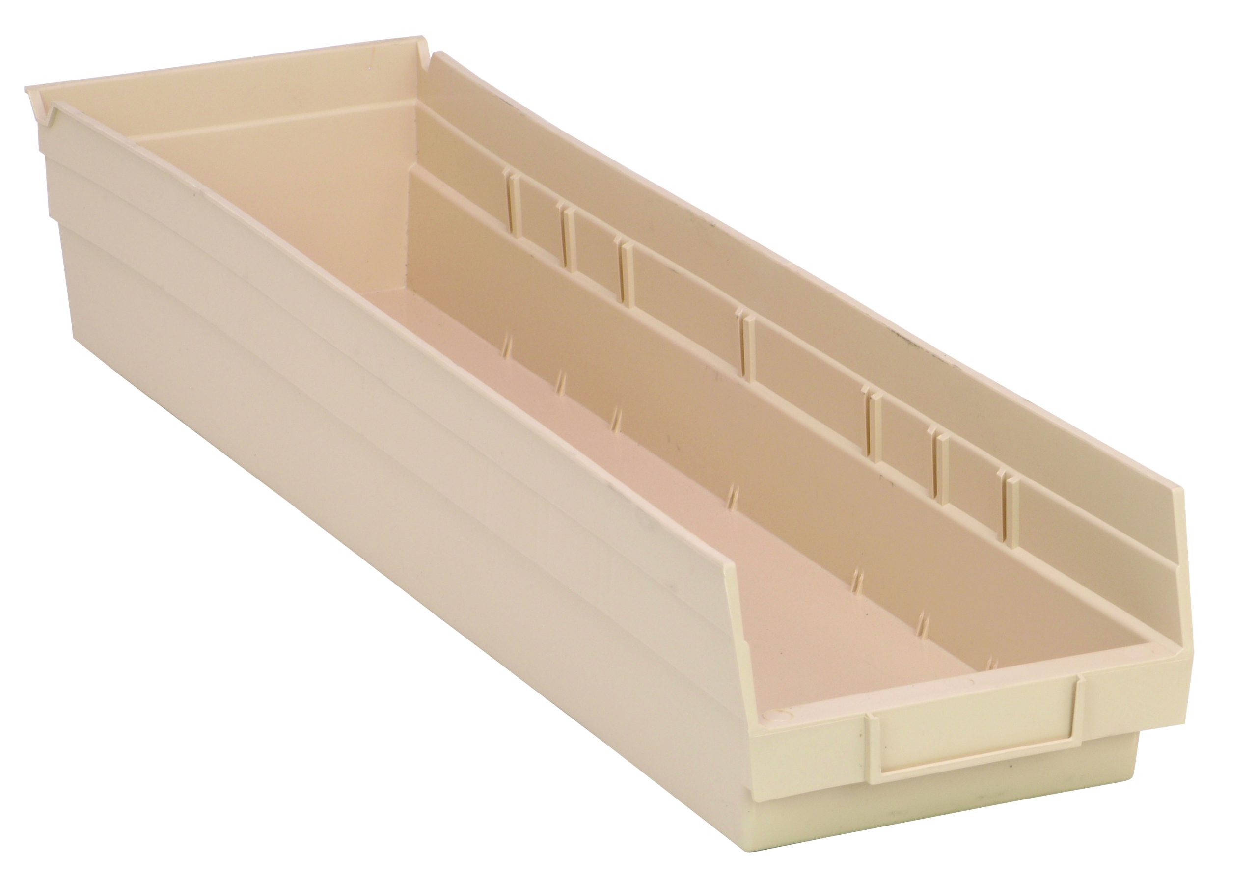Economy shelf bin, 23-5/8″W x 6-5/8″D x 4″H, includes (7) divider slots, rear hanglock, molded-in label holder, polypropylene, ivory, Made in USA