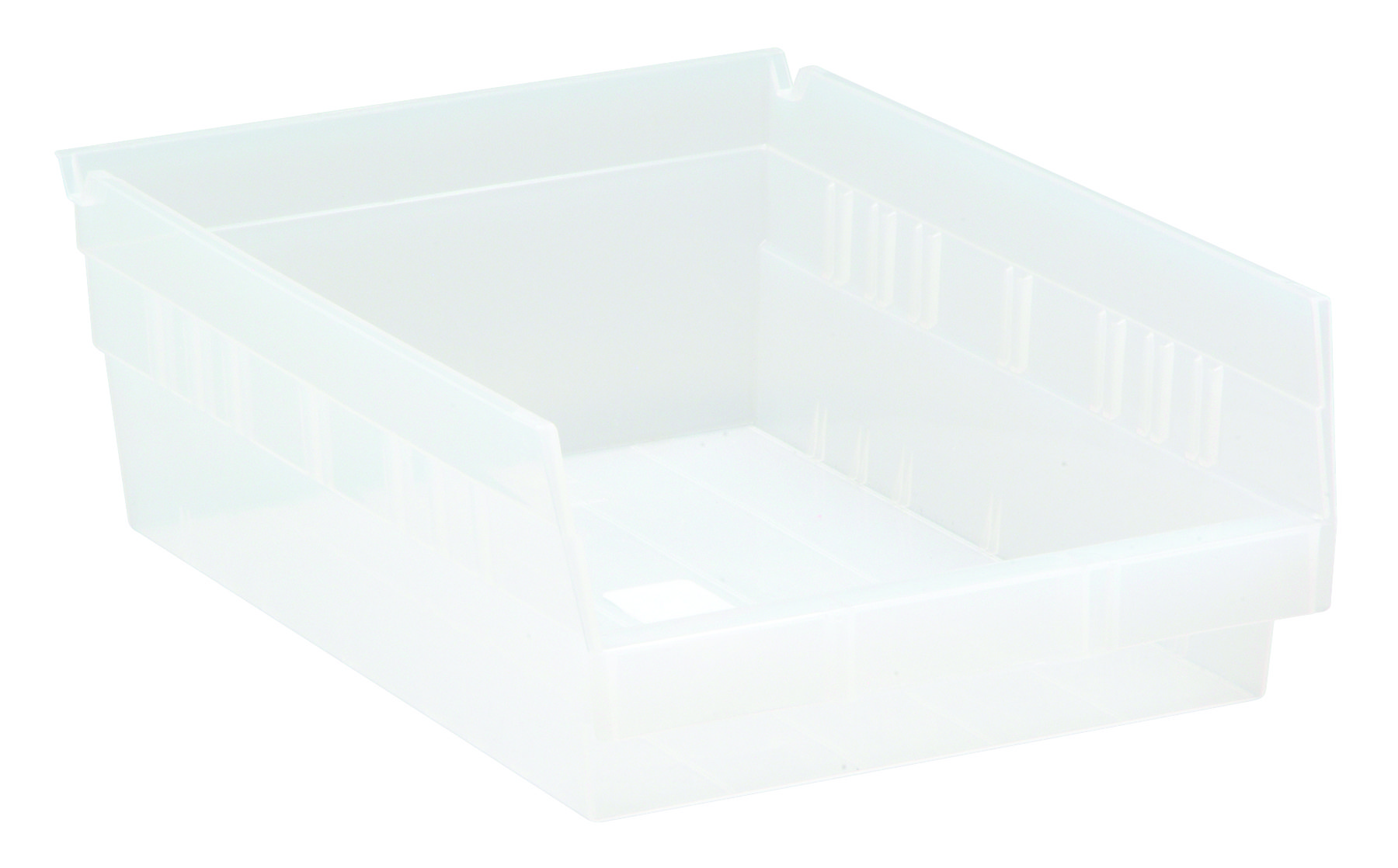 Economy Shelf Bin, nesting, 11-5/8″W x 8-3/8″D x 4″H, (7) divider slots, rear hanglock, molded-in label holder, clear polyropylene, Made in USA