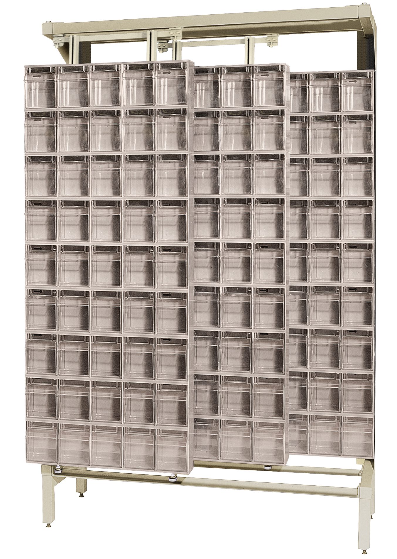Free Standing Slider, 18″D x 48″W x 77″H, 2000 lbs load capacity, made of though 14 gauge steel, includes: (36) QTB305 tip out ivory bins