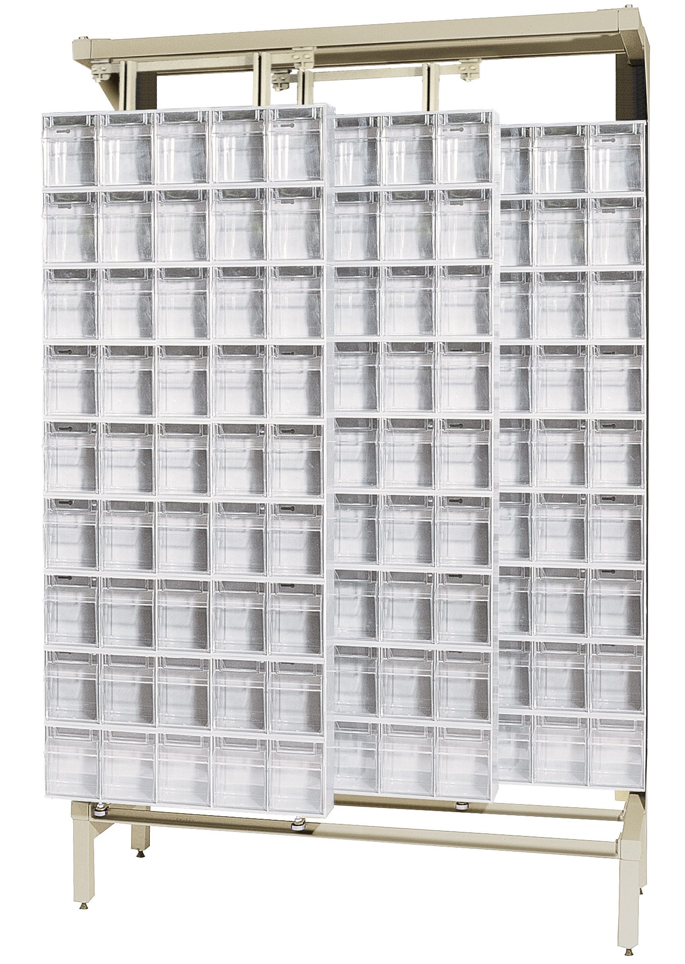 Free Standing Slider, 18″D x 48″W x 77″H, 2000 lbs load capacity, made of though 14 gauge steel, includes: (36) QTB305 tip out white bins