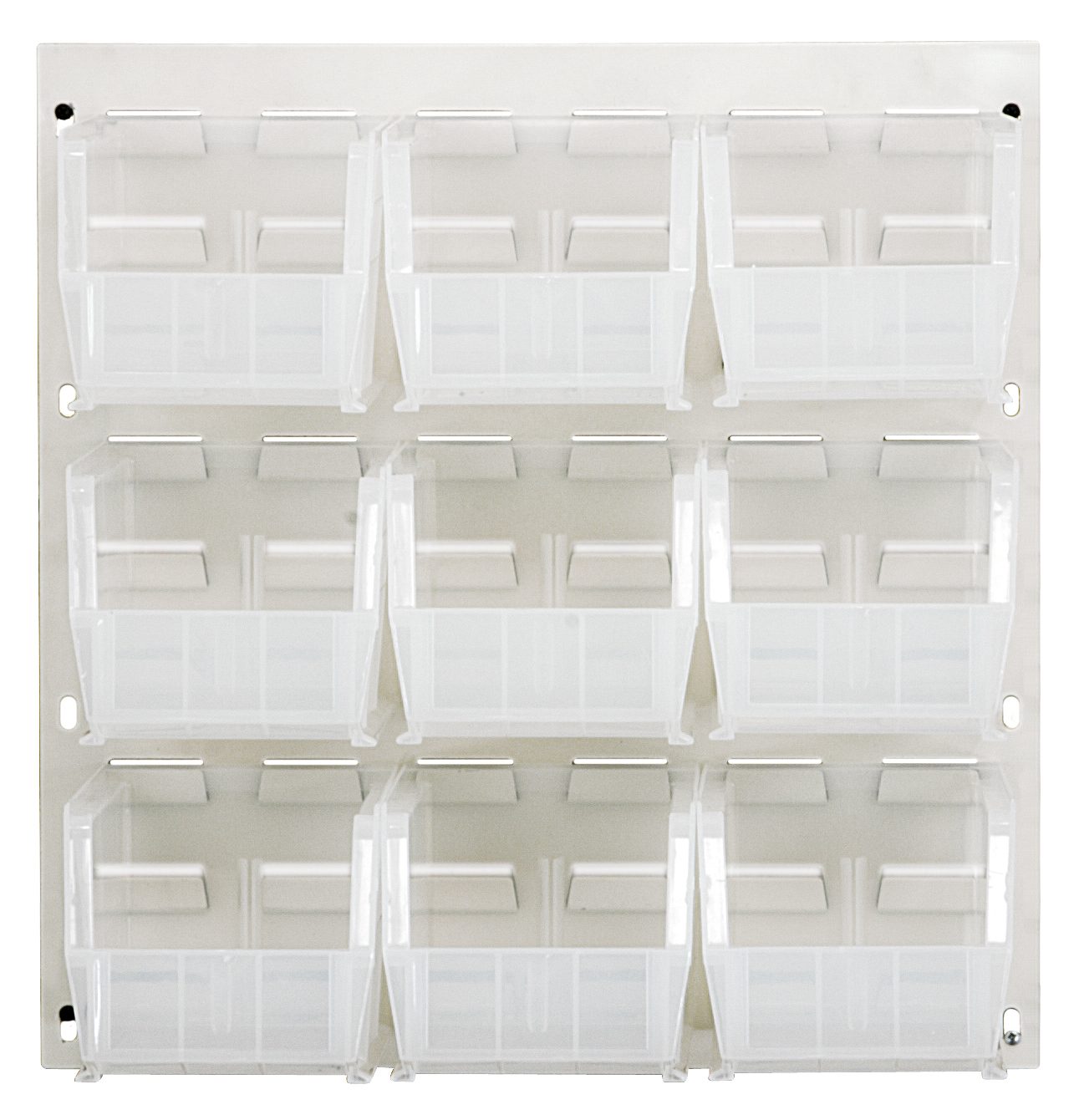 Quantum Louvered Panel, Wall Mounted, 18"L X 11"H, Includes: (9) QUS230, Clear Bins, Heavy-Duty 16 Gauge Cold Rolled Steel, Oyster White Enamel Coated Finish (Mounting Hardware Not Included) - QM-QLP-1819HC-230-9CL