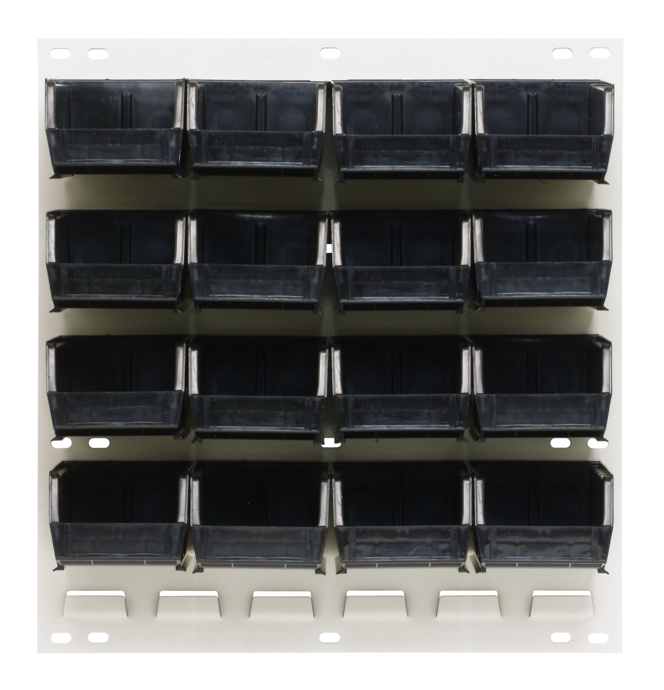 Quantum Louvered Panel, Wall Mounted, 18″L X 6″D X 19″H, Includes: (16) QUS210, Black Bins, Heavy-Duty 16 Gauge Cold Rolled Steel, Oyster White Enamel Coated Finish (Mounting Hardware Not Included)