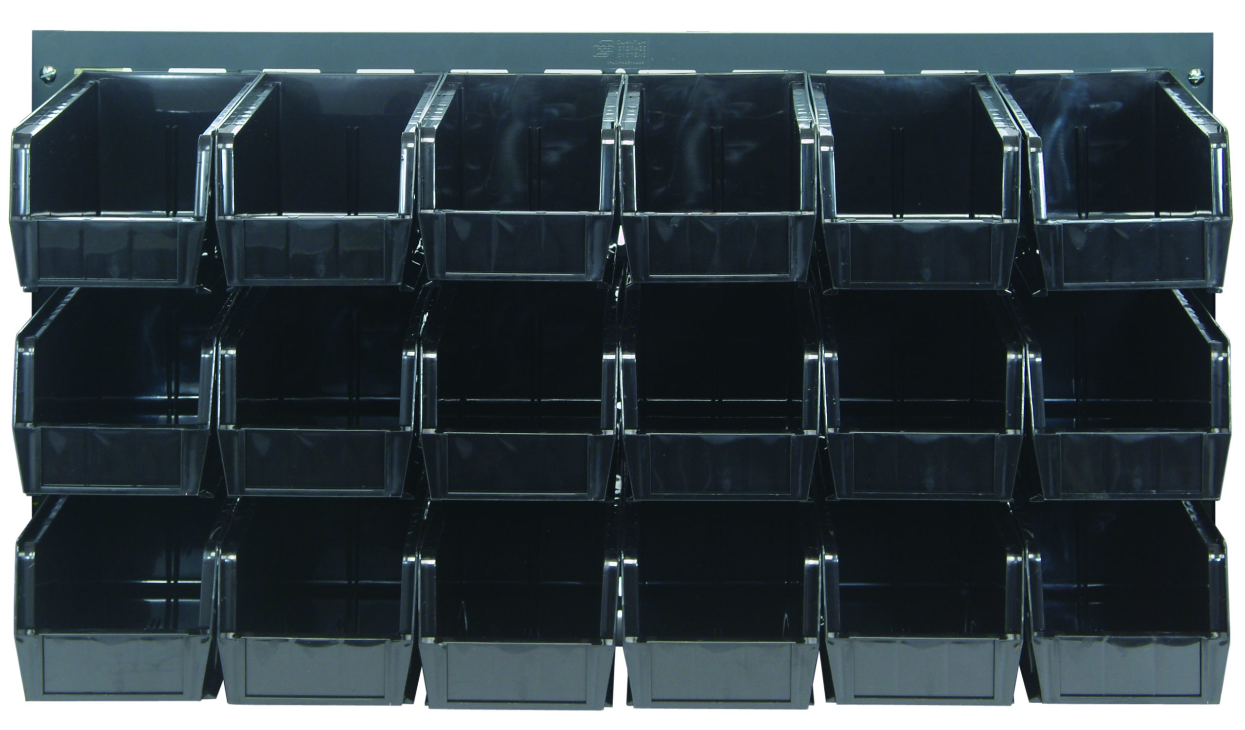 Quantum Louvered Panel, Wall Mounted, 36″L X 11″D X 19″H, Includes: (18) QUS230, Black Bins, Heavy-Duty 16 Gauge Cold Rolled Steel, Gray Enamel Coated Finish (Mounting Hardware Not Included)