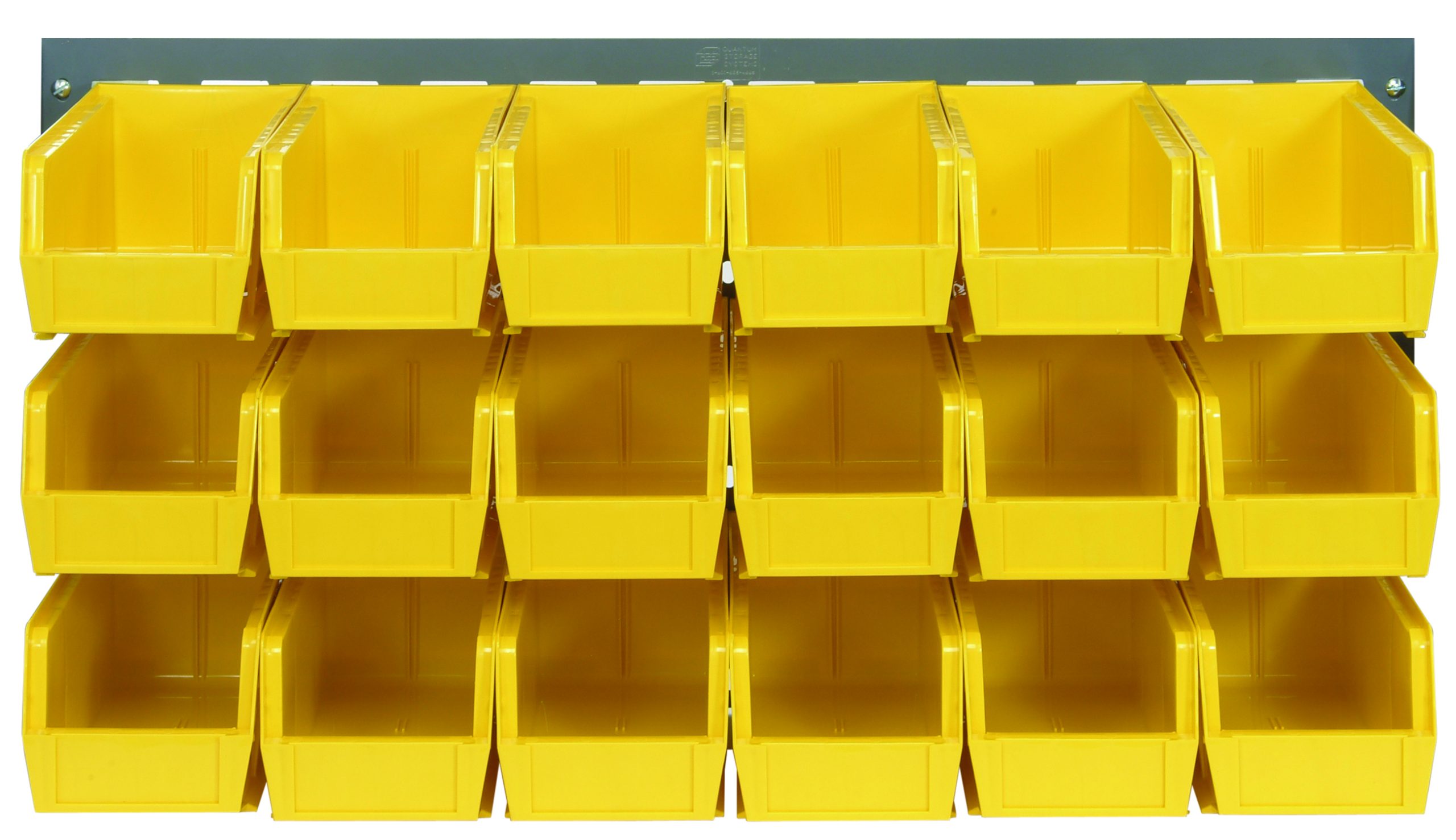Quantum Louvered Panel, Wall Mounted, 36″L X 11″D X 19″H, Includes: (18) QUS230, Clear Bins, Heavy-Duty 16 Gauge Cold Rolled Steel, Gray Enamel Coated Finish (Mounting Hardware Not Included) – QM-QLP-3619-230-18YL