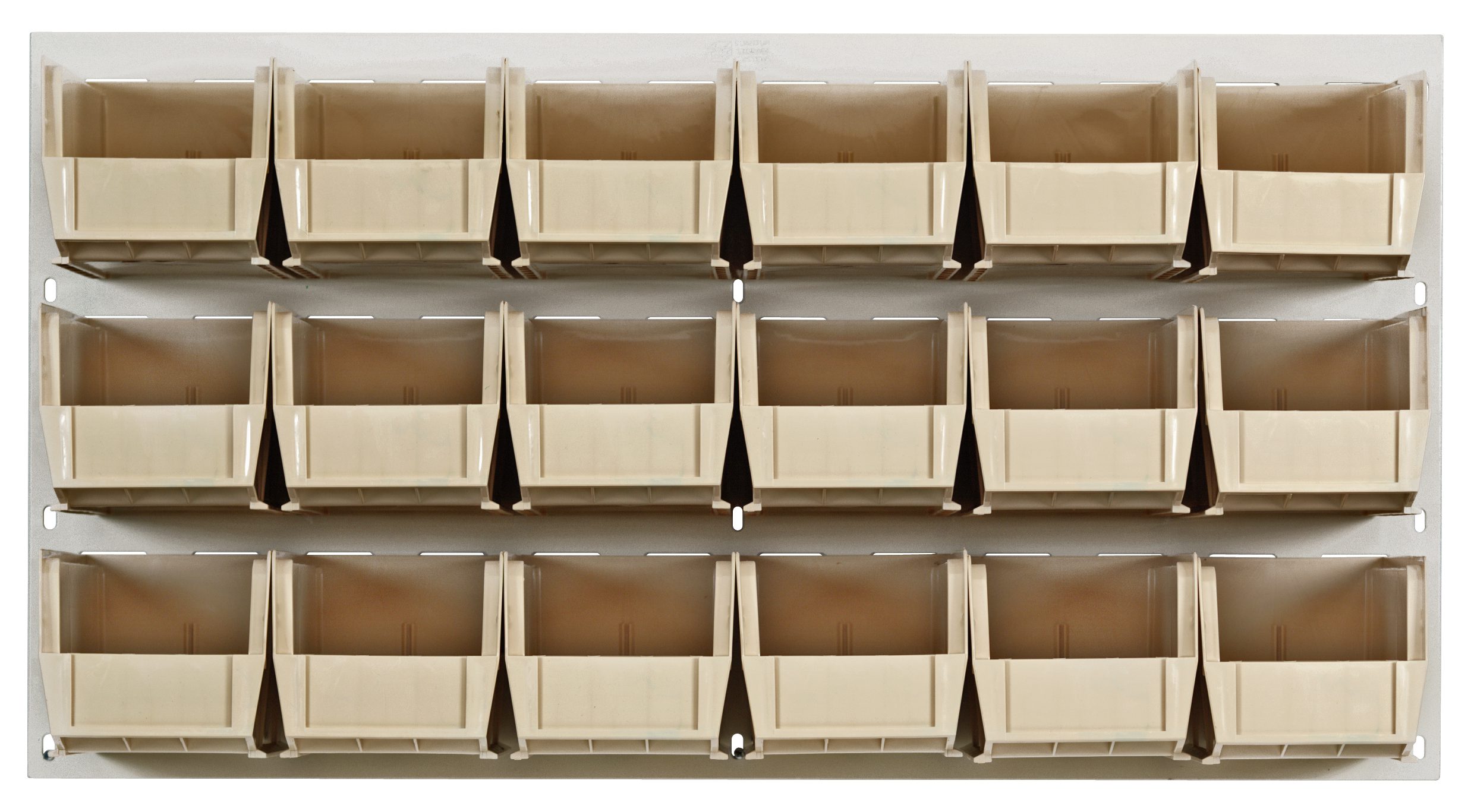 Quantum Louvered Panel, Wall Mounted, 36″L X 11″D X 19″H, Includes: (18) QUS230, Clear Bins, Heavy-Duty 16 Gauge Cold Rolled Steel, Oyster White Enamel Coated Finish (Mounting Hardware Not Included) – QM-QLP-3619HC-230-18IV