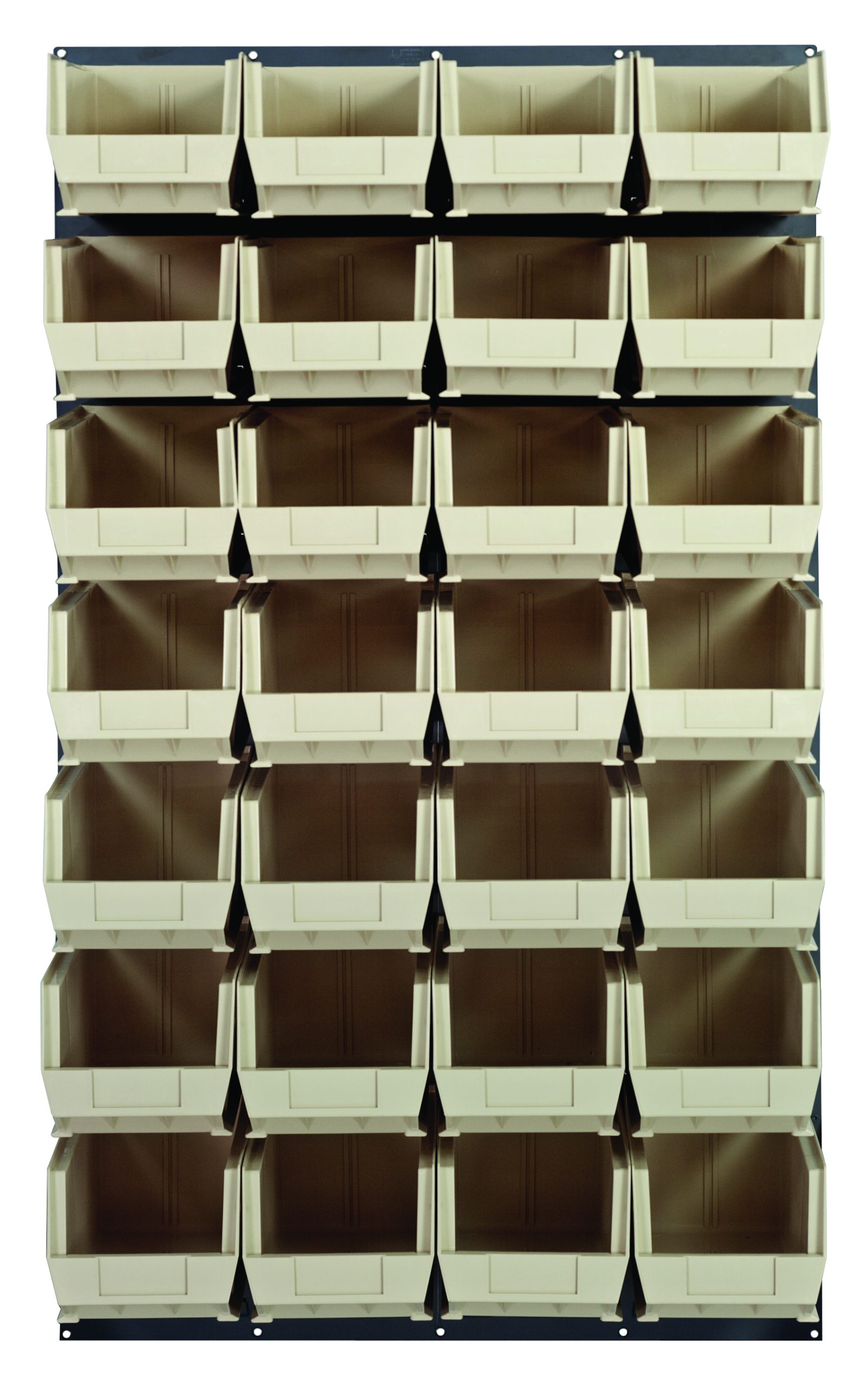Louvered Panel, wall mounted, 36″L x 15″D x 61″H, includes: (28) QUS240, clear bins, heavy-duty 16 gauge cold rolled steel, gray enamel coated finish (mounting hardware not included)