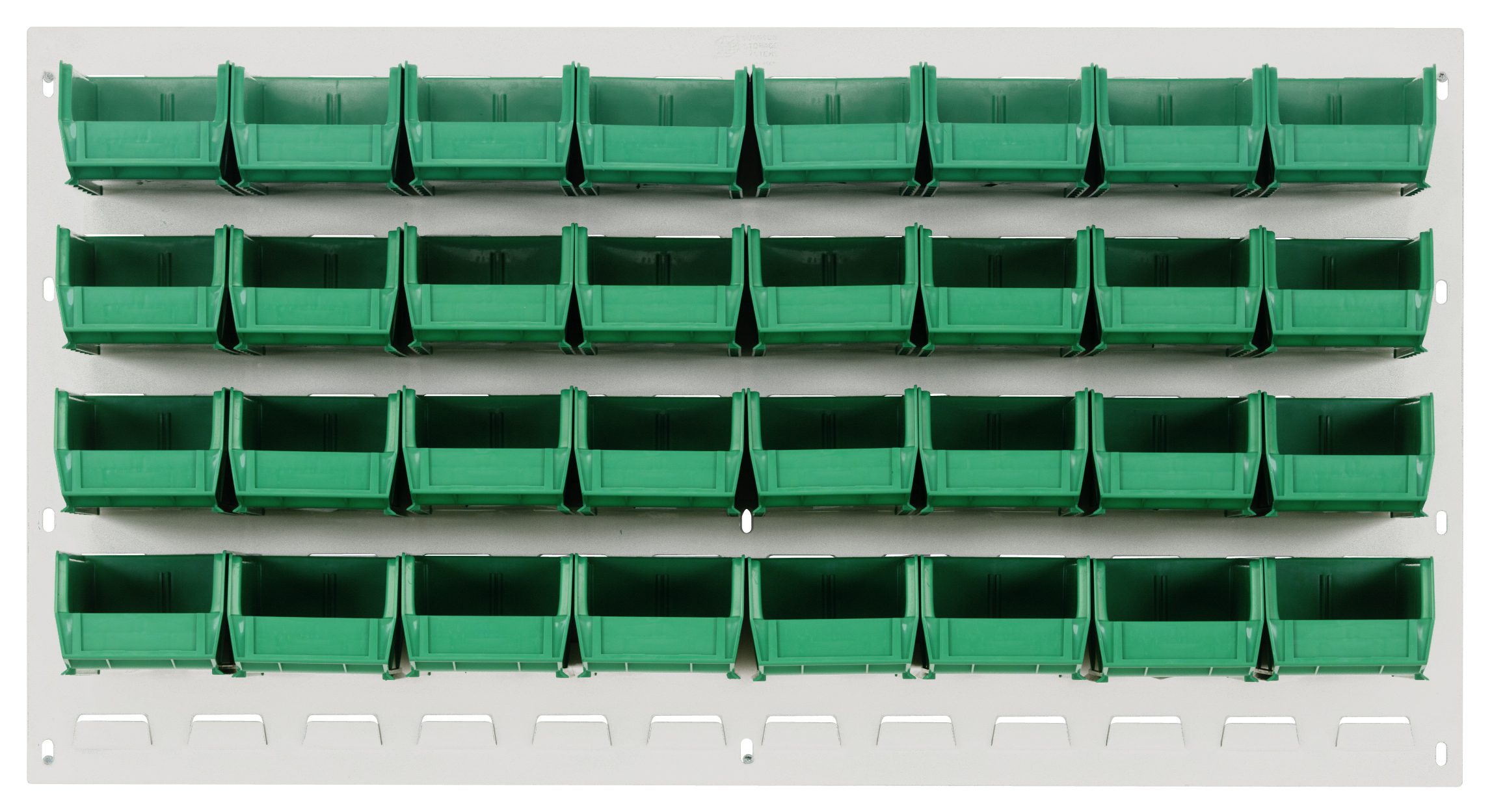 Louvered Panel, wall mounted, 36″L x 8″D x 19″H, includes: (32) QUS220, clear bins, heavy-duty 16 gauge cold rolled steel, oyster white enamel coated finish (mounting hardware not included)