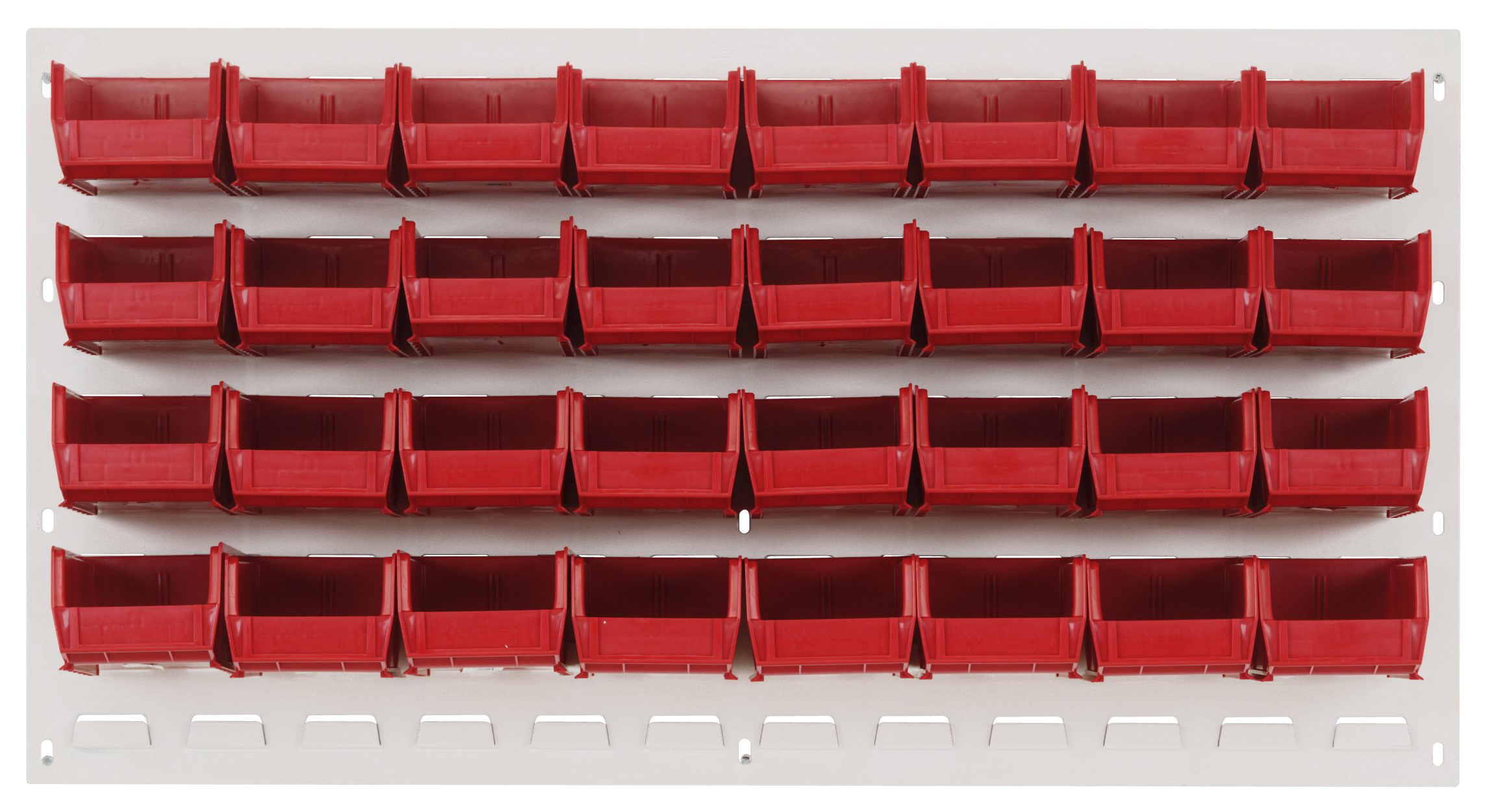 Quantum Louvered Panel, Wall Mounted, 36″L X 8″D X 19″H, Includes: (32) QUS220, Clear Bins, Heavy-Duty 16 Gauge Cold Rolled Steel, Oyster White Enamel Coated Finish (Mounting Hardware Not Included) – QM-QLP-3619HC-220-32RD