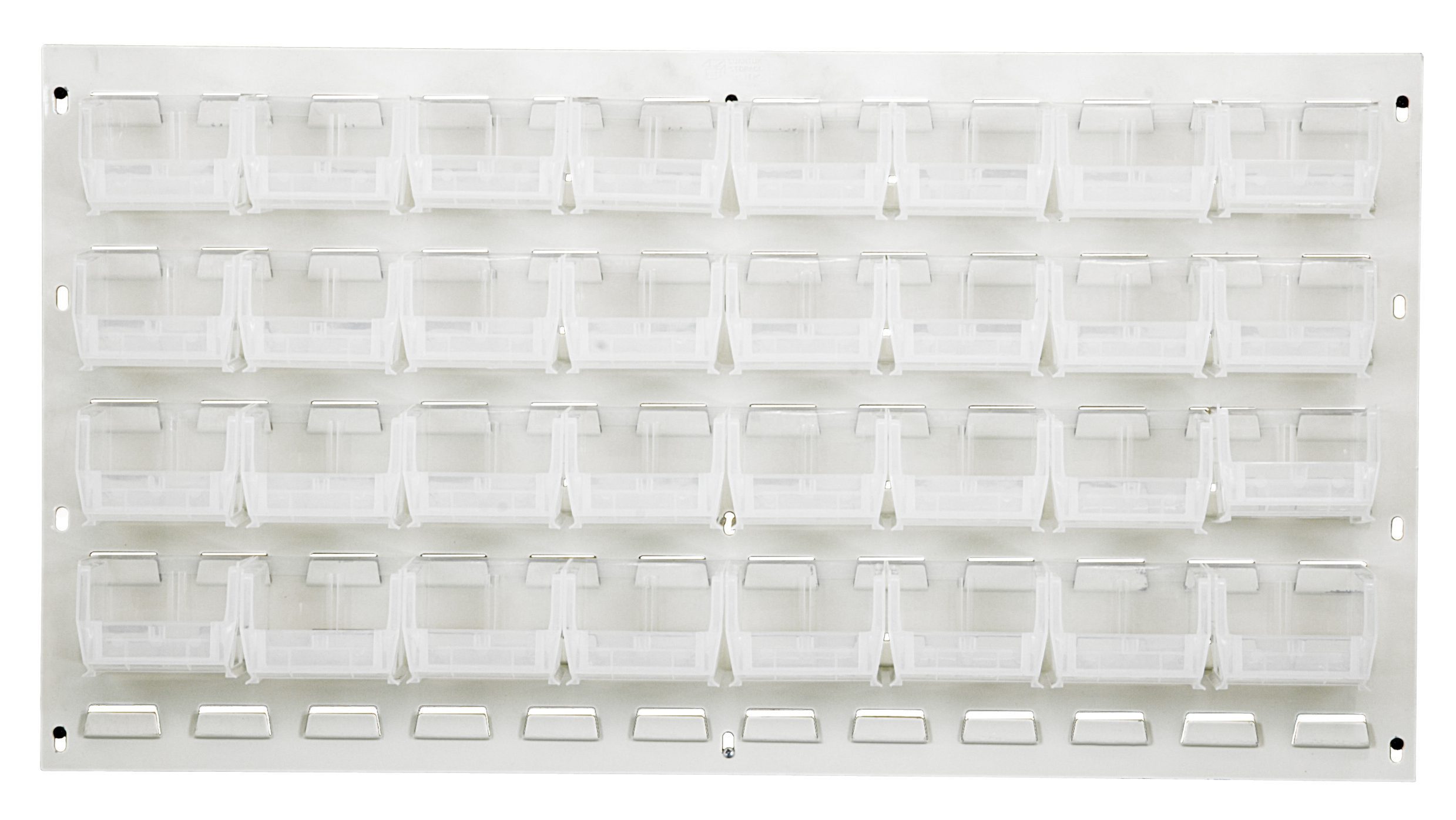 Quantum Louvered Panel, Wall Mounted, 36″L X 8″D X 19″H, Includes: (32) QUS220, Clear Bins, Heavy-Duty 16 Gauge Cold Rolled Steel, Oyster White Enamel Coated Finish (Mounting Hardware Not Included) – QM-QLP-3619HC-220-32CL
