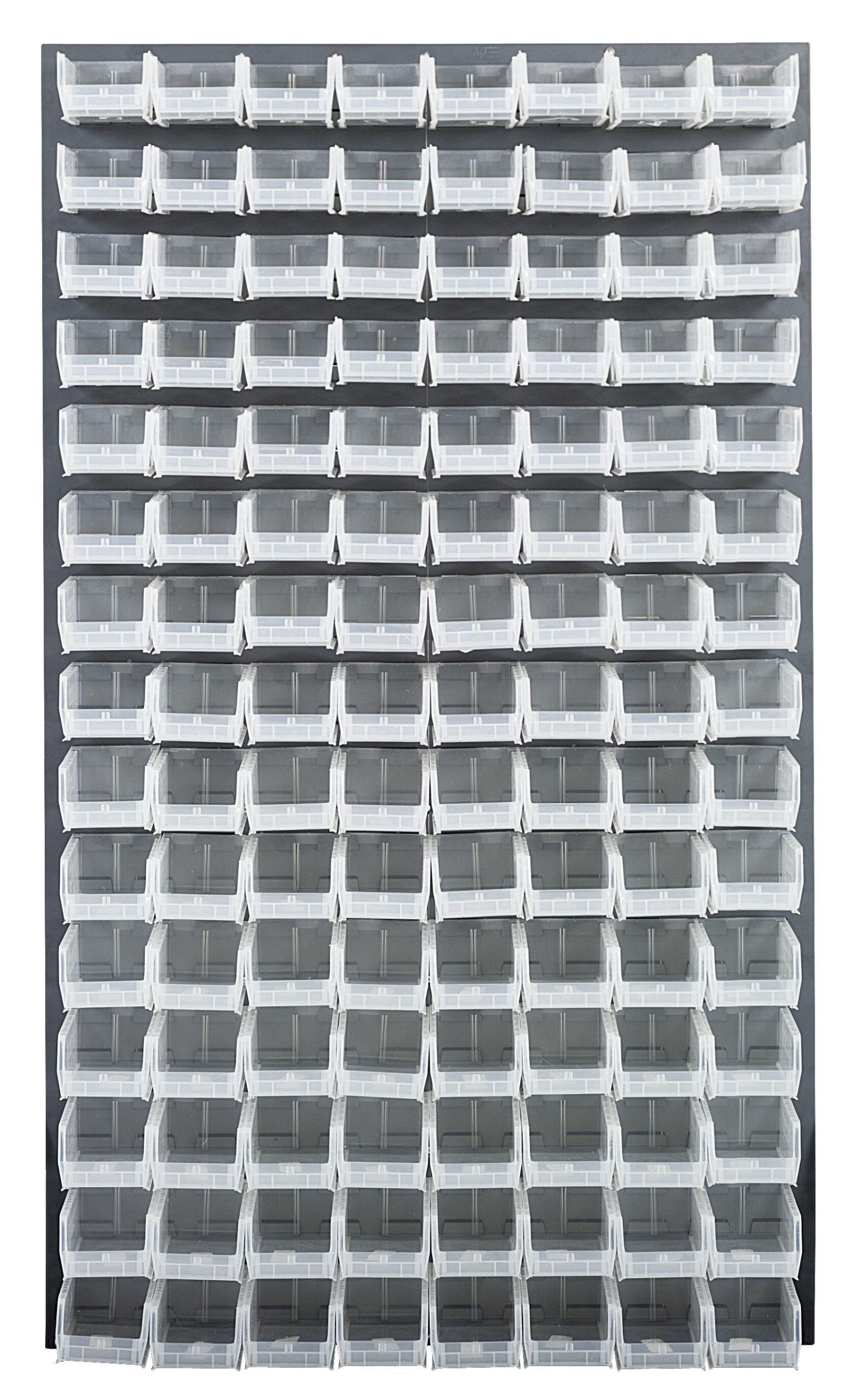 Louvered Panel, wall mounted, 36″L x 8″D x 61″H, includes: (120) QUS220, clear bins, heavy-duty 16 gauge cold rolled steel, gray enamel coated finish (mounting hardware not included)
