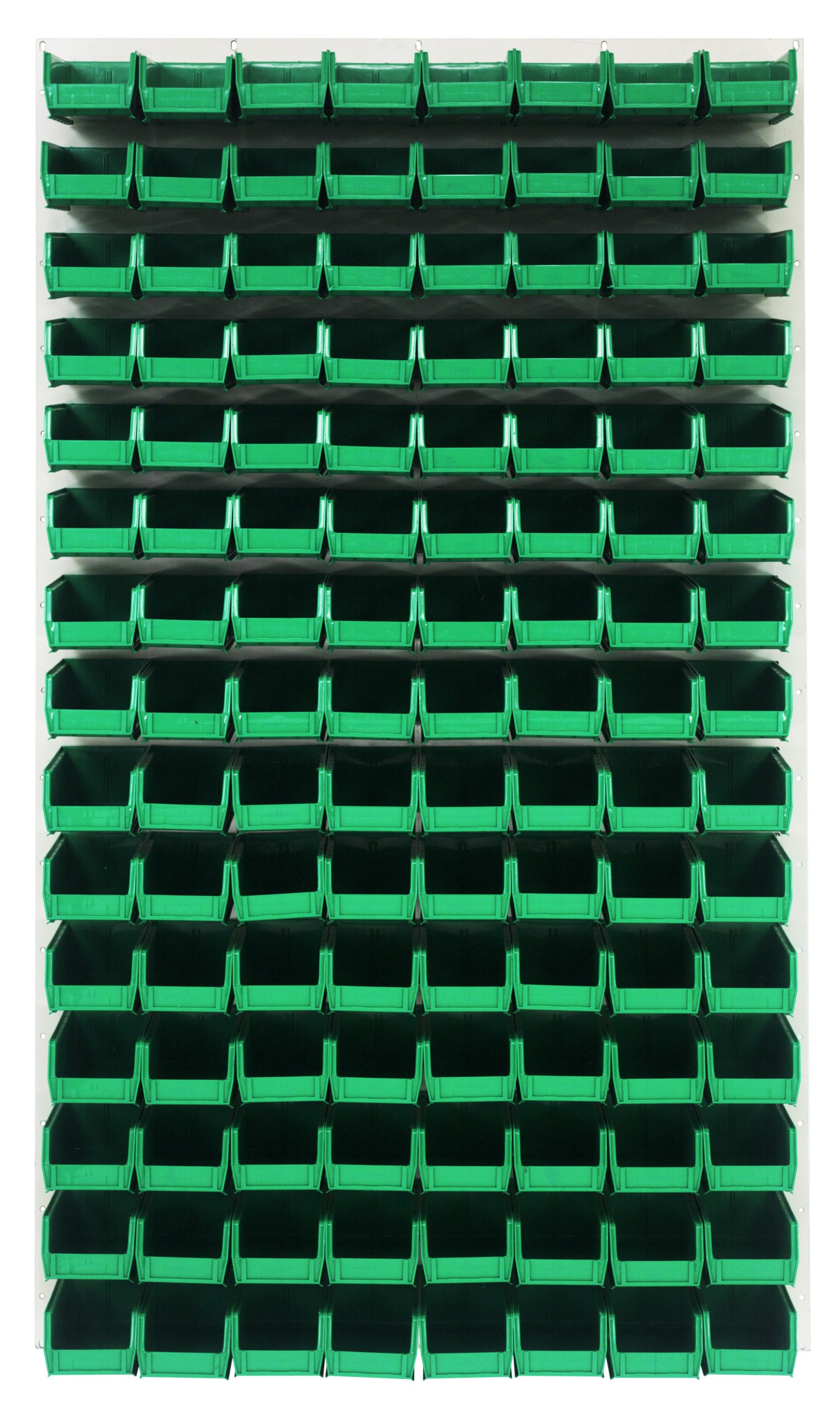Louvered Panel, wall mounted, 36″L x 8″D x 61″H, includes: (120) QUS220, clear bins, heavy-duty 16 gauge cold rolled steel, oyster white enamel coated finish (mounting hardware not included)