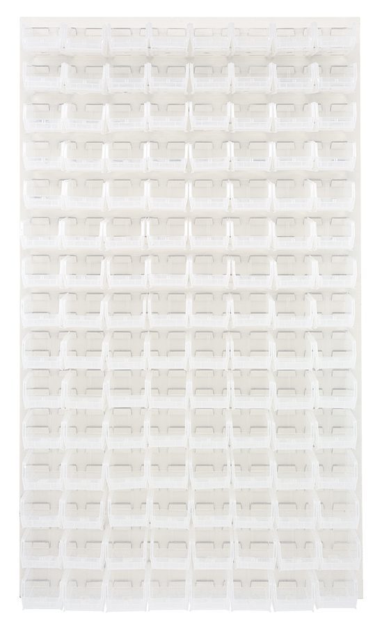 Louvered Panel, wall mounted, 36″L x 8″D x 61″H, includes: (120) QUS220, clear bins, heavy-duty 16 gauge cold rolled steel, oyster white enamel coated finish (mounting hardware not included)
