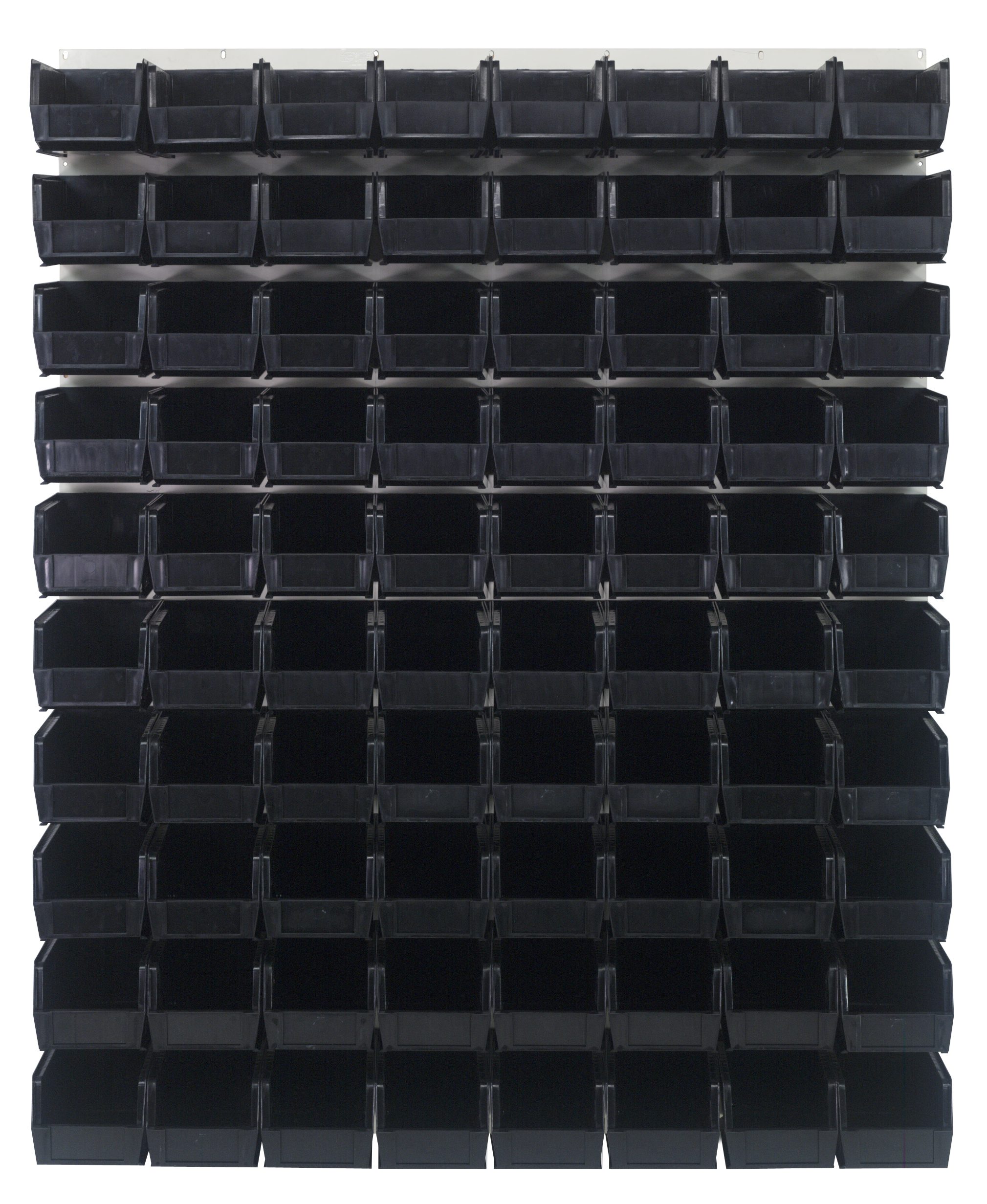 Quantum Louvered Panel, Wall Mounted, 48″L X 11″D X 61″H, Includes: (80) QUS230, Black Bins, Heavy-Duty 16 Gauge Cold Rolled Steel, Oyster White Enamel Coated Finish (Mounting Hardware Not Included)