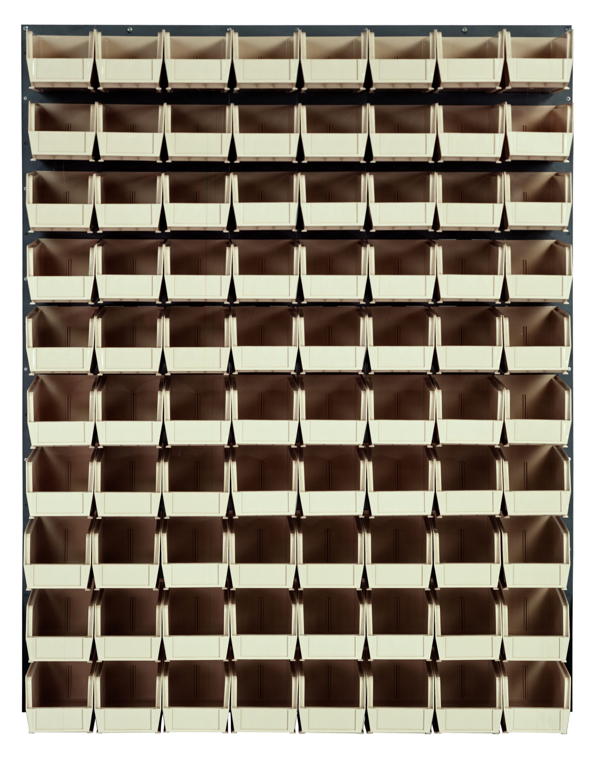 Louvered Panel, wall mounted, 48″L x 11″D x 61″H, includes: (80) QUS230, clear bins, heavy-duty 16 gauge cold rolled steel, gray enamel coated finish (mounting hardware not included)