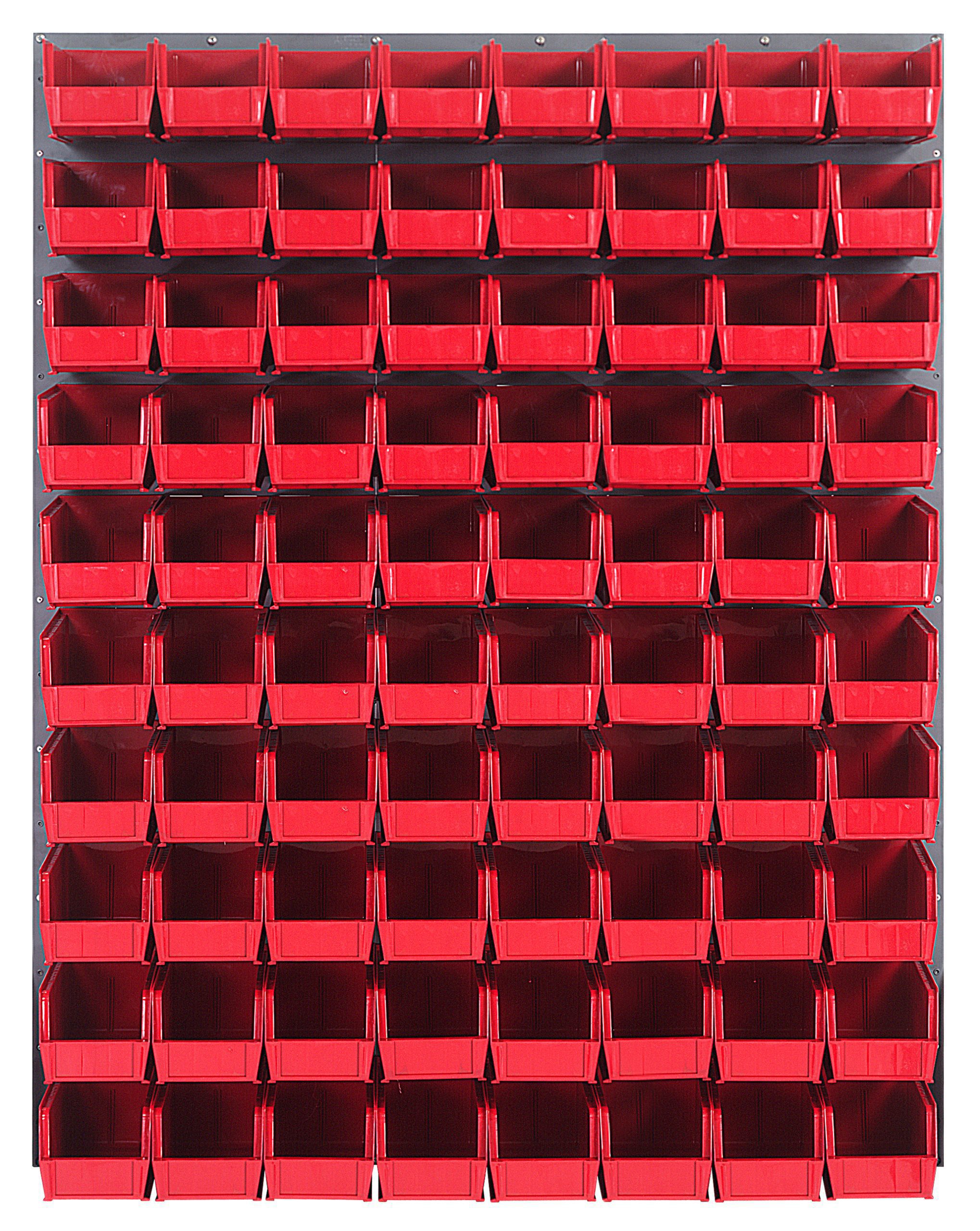 Louvered Panel, wall mounted, 48″L x 11″D x 61″H, includes: (80) QUS230, clear bins, heavy-duty 16 gauge cold rolled steel, gray enamel coated finish (mounting hardware not included)