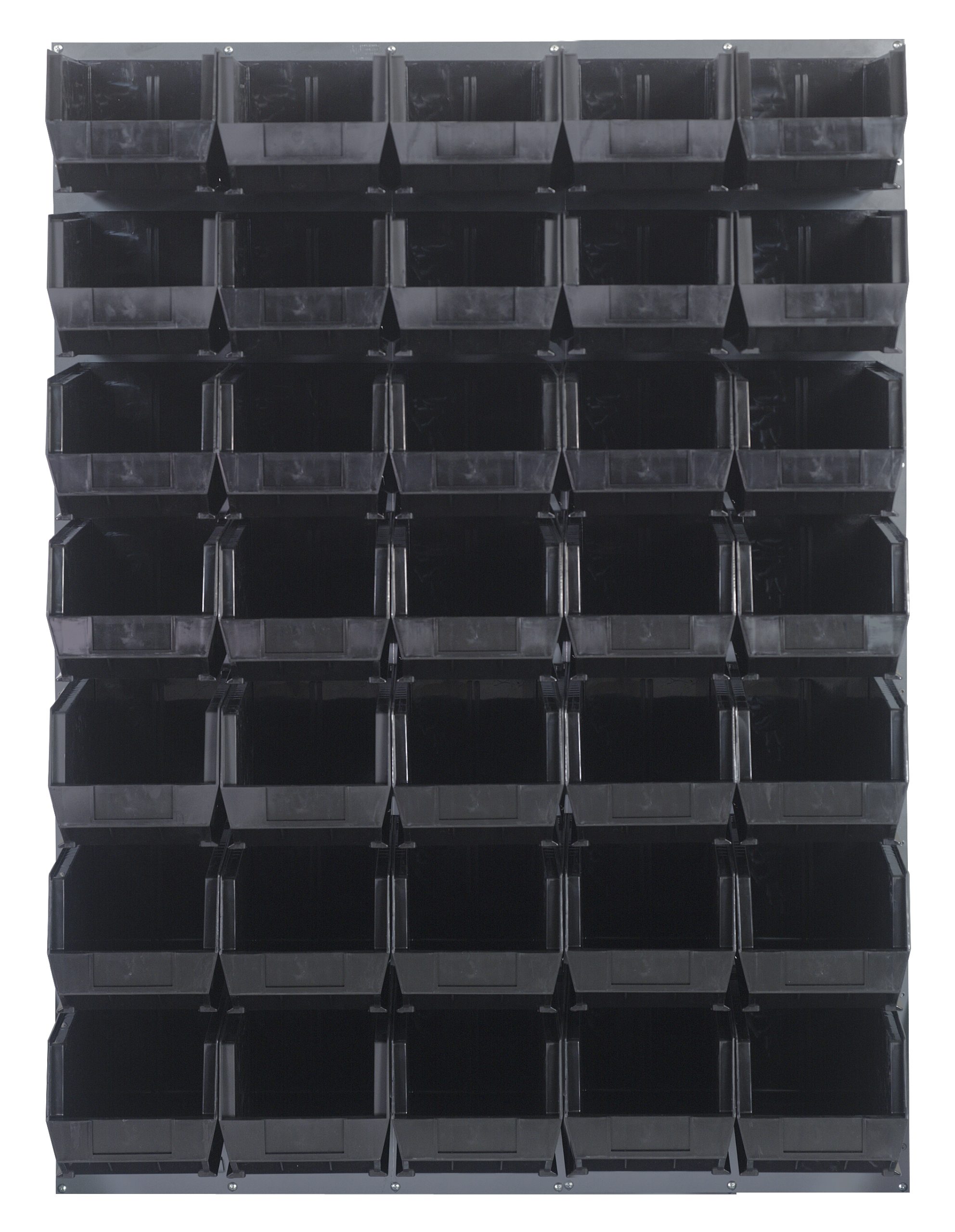 Louvered Panel, wall mounted, 48″L x 15″D x 61″H, includes: (35) QUS240, black bins, heavy-duty 16 gauge cold rolled steel, gray enamel coated finish (mounting hardware not included)