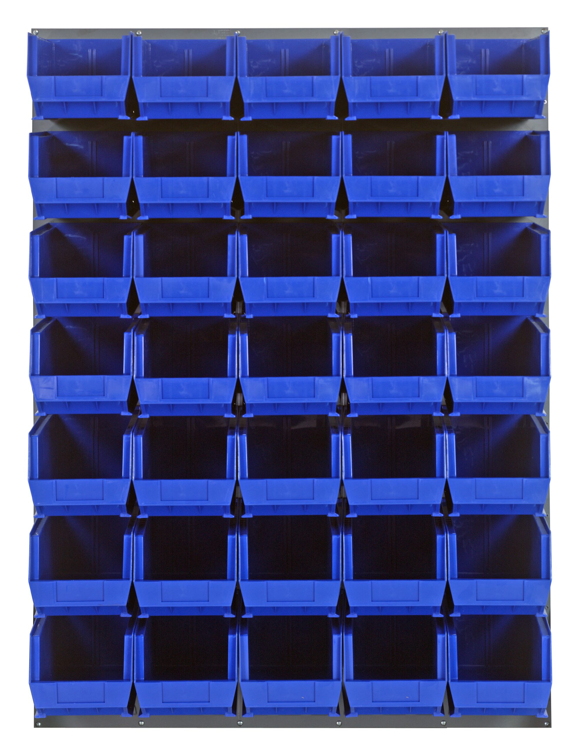 Louvered Panel, wall mounted, 48″L x 15″D x 61″H, includes: (35) QUS240, blue bins, heavy-duty 16 gauge cold rolled steel, gray enamel coated finish (mounting hardware not included)