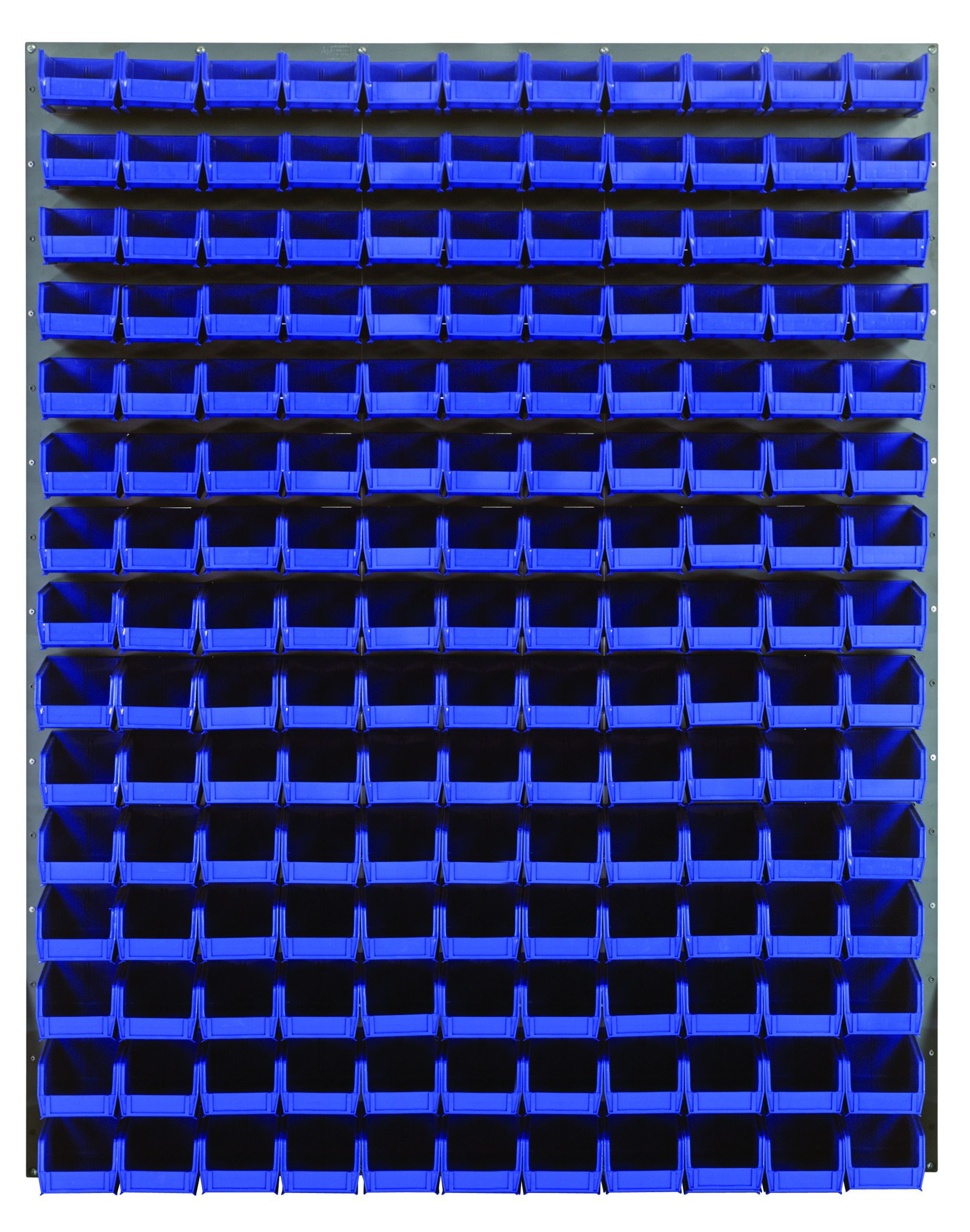 Louvered Panel, wall mounted, 48″L x 8″D x 61″H, includes: (165) QUS220, blue bins, heavy-duty 16 gauge cold rolled steel, gray enamel coated finish (mounting hardware not included)