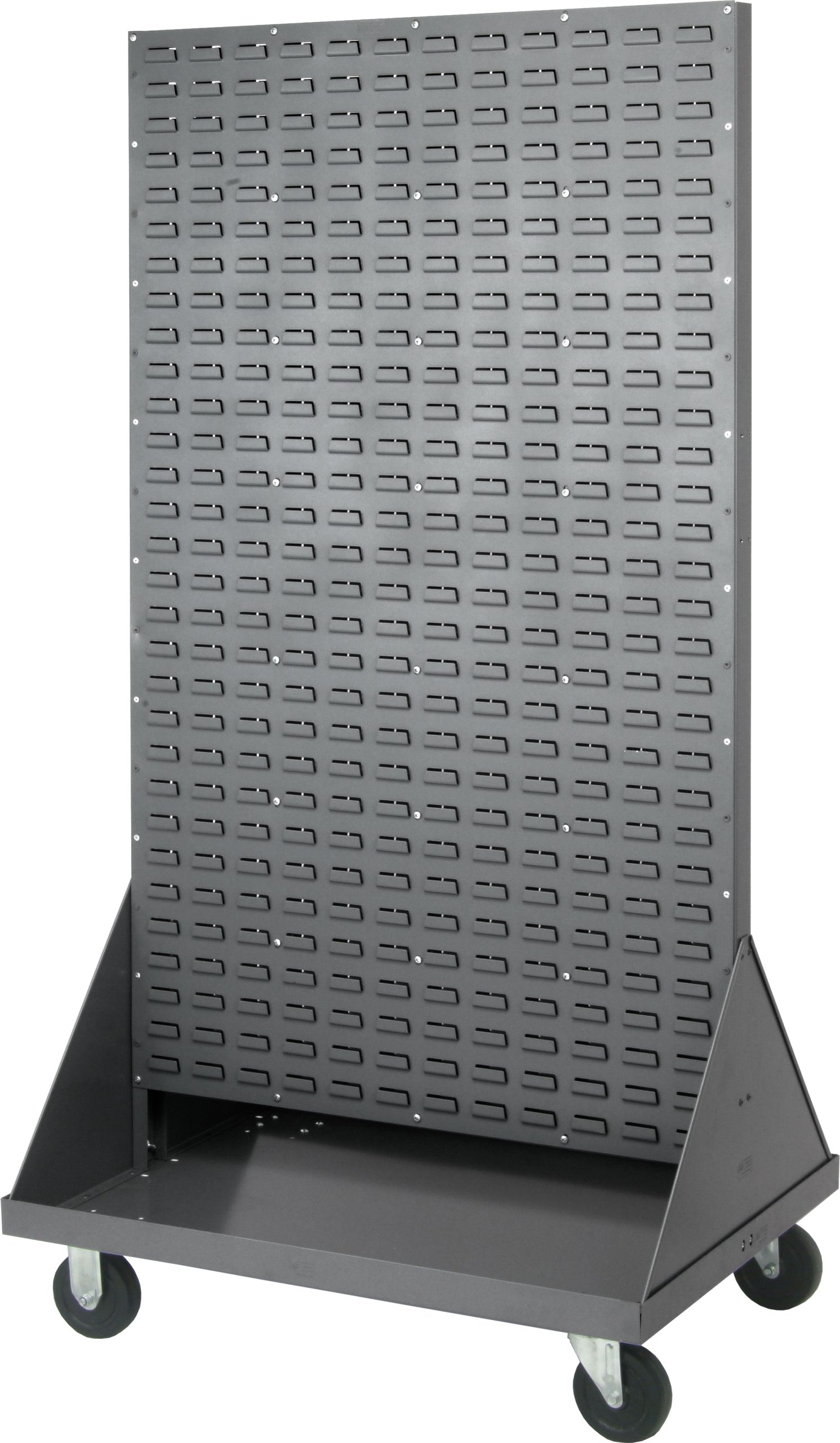 Louvered Rack, 36″W x 25″D x 72″H, 1200 lb. capacity, double sided,Includes: handle and (4) 5″ rubber heavy-duty casters: (2) rigid and (2) swivel, 16 gauge, gray enamel coated steel, shipped KD