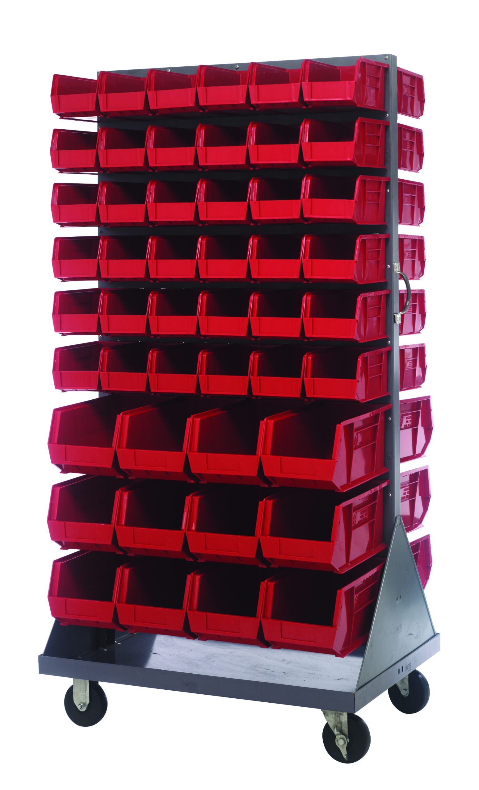 Louvered Rack, 36″W x 30″D x 72″H, 1200 lb. capacity, double sided,Includes: (72) QUS230 and (24) QUS240, handle and (4) 5″ rubber heavy-duty casters: (2) rigid and (2) swivel, red bins, 16 gauge cold rolled steel, gray enamel coated steel, shipped KD