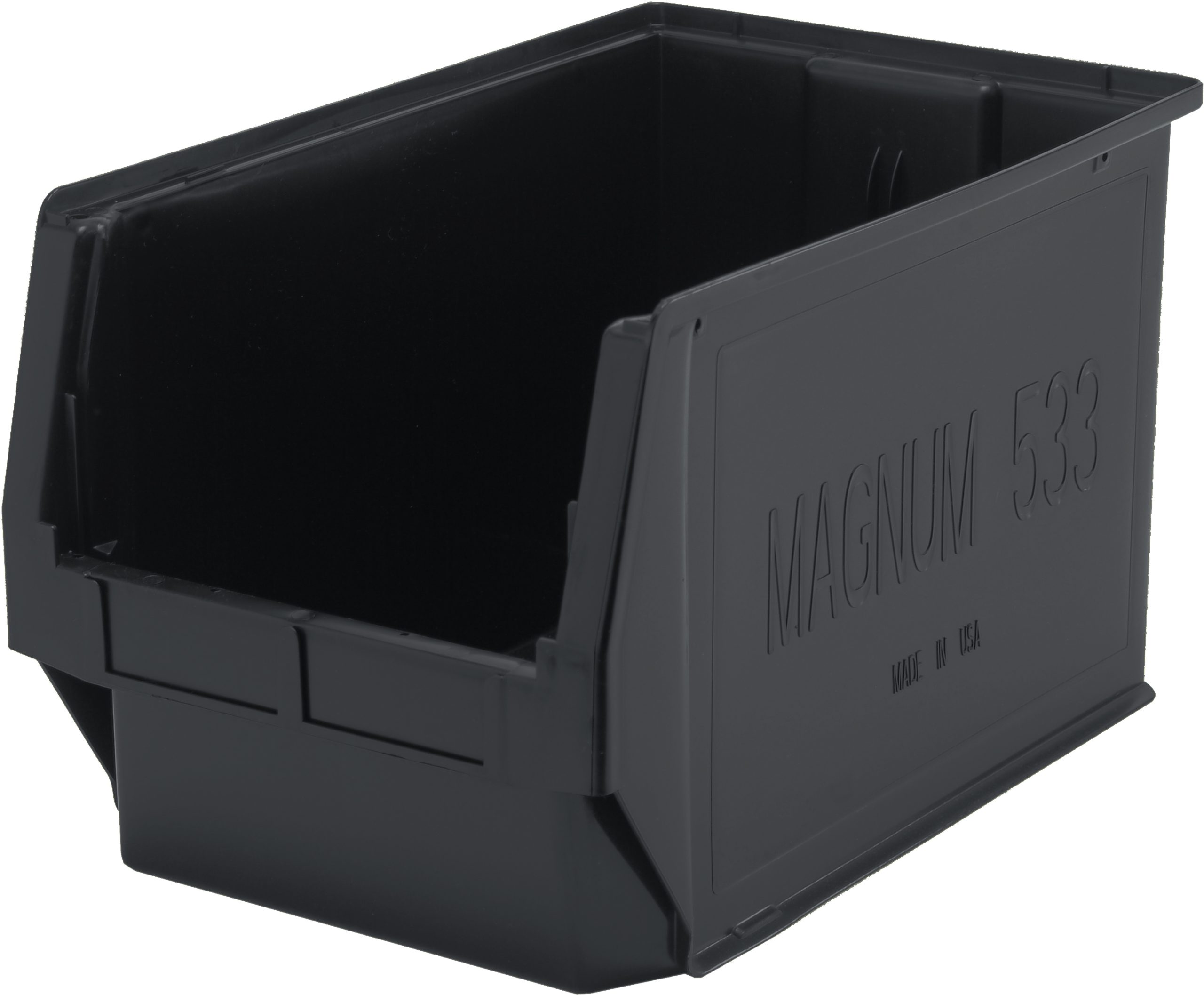 Magnum Bin, 19-3/4″L x 12-3/8″W x 11-7/8″H, 150 lbs. stack capacity, high density polypropylene, imprevious to most solvents, corrosion, rust and rot resistant, black, Made in USA