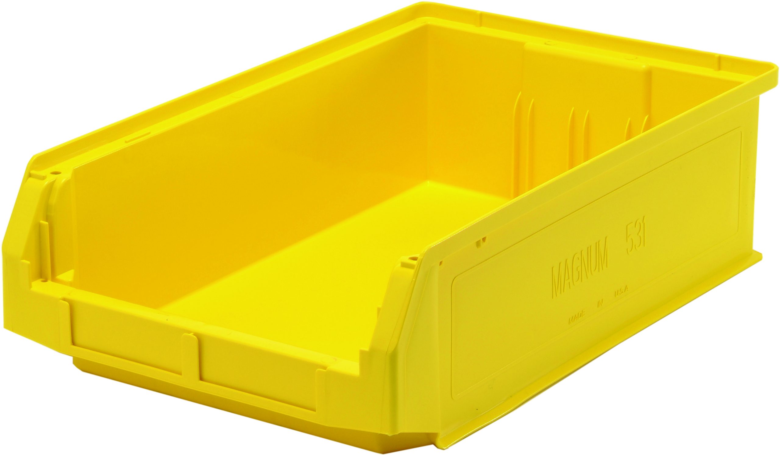 Magnum Bin, 19-3/4″L x 12-3/8″W x 5-7/8″H, 150 lbs. stack capacity, high density polypropylene, imprevious to most solvents, corrosion, rust and rot resistant, yellow, Made in USA