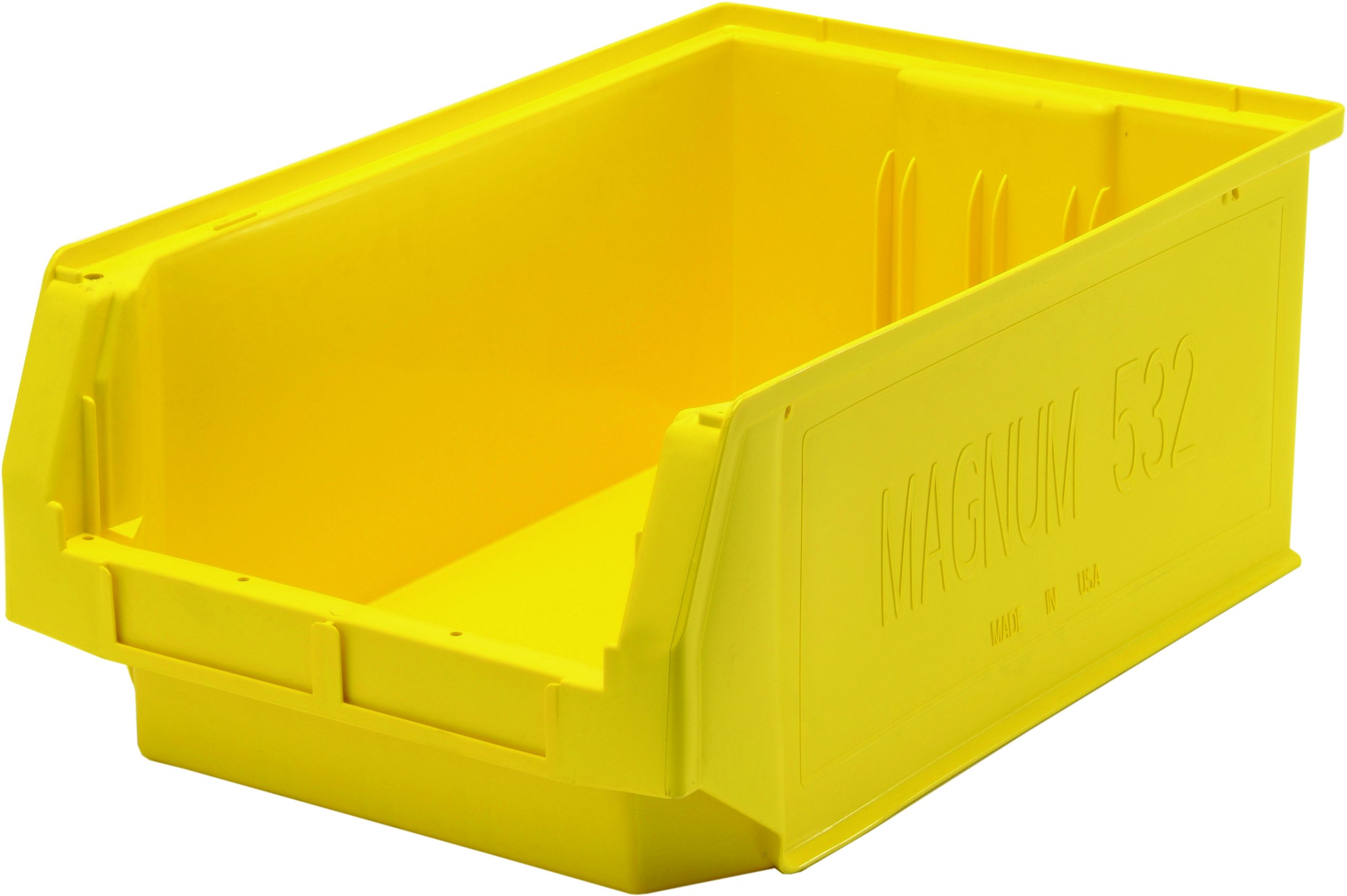 Magnum Bin, 19-3/4″L x 12-3/8″W x 7-7/8″H, 150 lbs. stack capacity, high density polypropylene, imprevious to most solvents, corrosion, rust and rot resistant, yellow, Made in USA