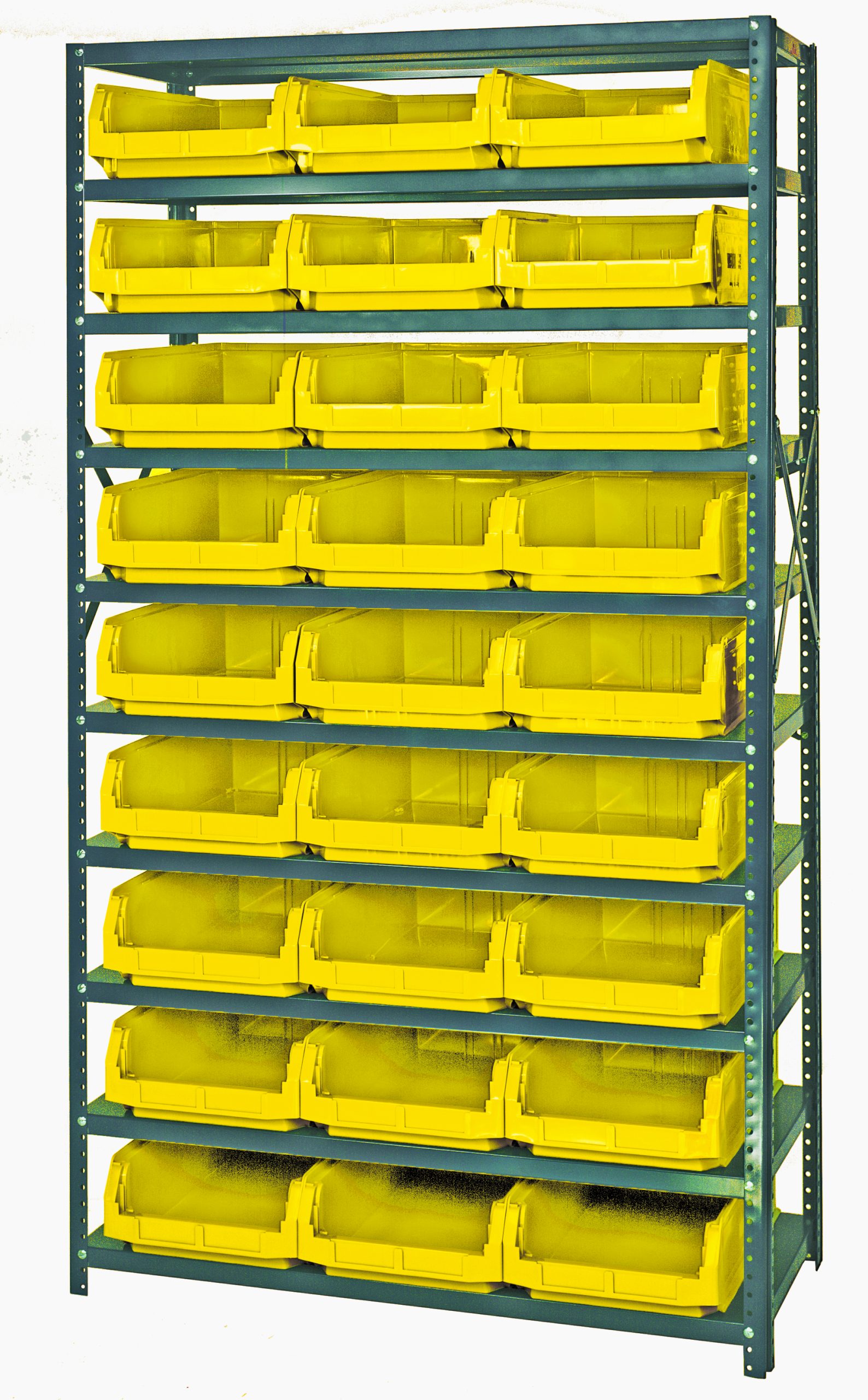 Quantum Magnum Bin Steel Shelving, 42″W X 18″D X 75″H, Includes: (10) Shelves And (27) 19-3/4″L X 12-3/8″W X 5-7/8″H (QMS531) Yellow Bins, Corrosion And Rust Resistant, Made In USA