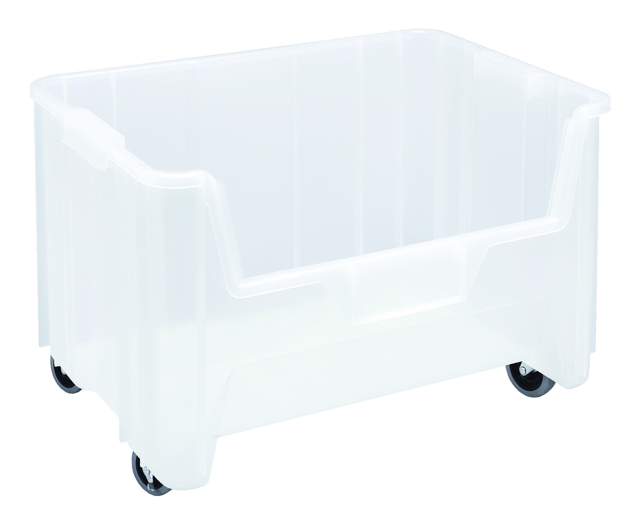 Quantum Mobile Container, Stacking, 15-1/4″ X 19-7/8″ X 15-7/16″, Injection Molded High Density Polypropylene, Six 1/4″ Drill Hole Pattern On Bottom Allows For Easy Hole Insertion For Drainage And Air Circulation, Includes: (4) 3″ Polyurethane Swivel Casters, Clear, Made In USA