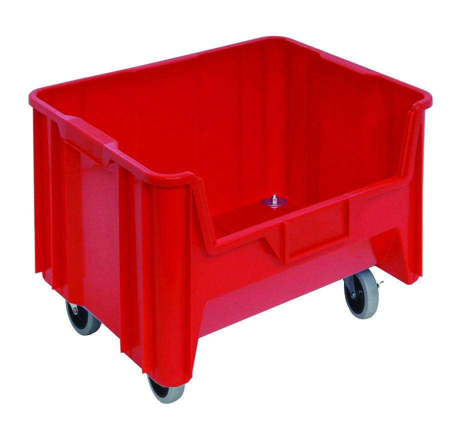 Quantum Mobile Container, Stacking, 15-1/4″ X 19-7/8″ X 15-7/16″, Injection Molded High Density Polypropylene, Six 1/4″ Drill Hole Pattern On Bottom Allows For Easy Hole Insertion For Drainage And Air Circulation, Includes: (4) 3″ Polyurethane Swivel Casters, Red, Made In USA