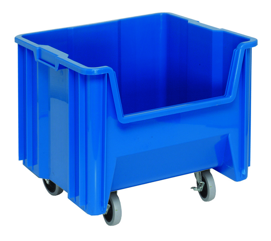 Mobile Container, stacking, 17-1/2″ x 16-1/2″ x 15-1/2″, injection molded high density polypropylene, six 1/4″ drill hole pattern on bottom allows for easy hole insertion for drainage and air circulation, includes: (4) 3″ polyurethane swivel casters, blue, Made in USA