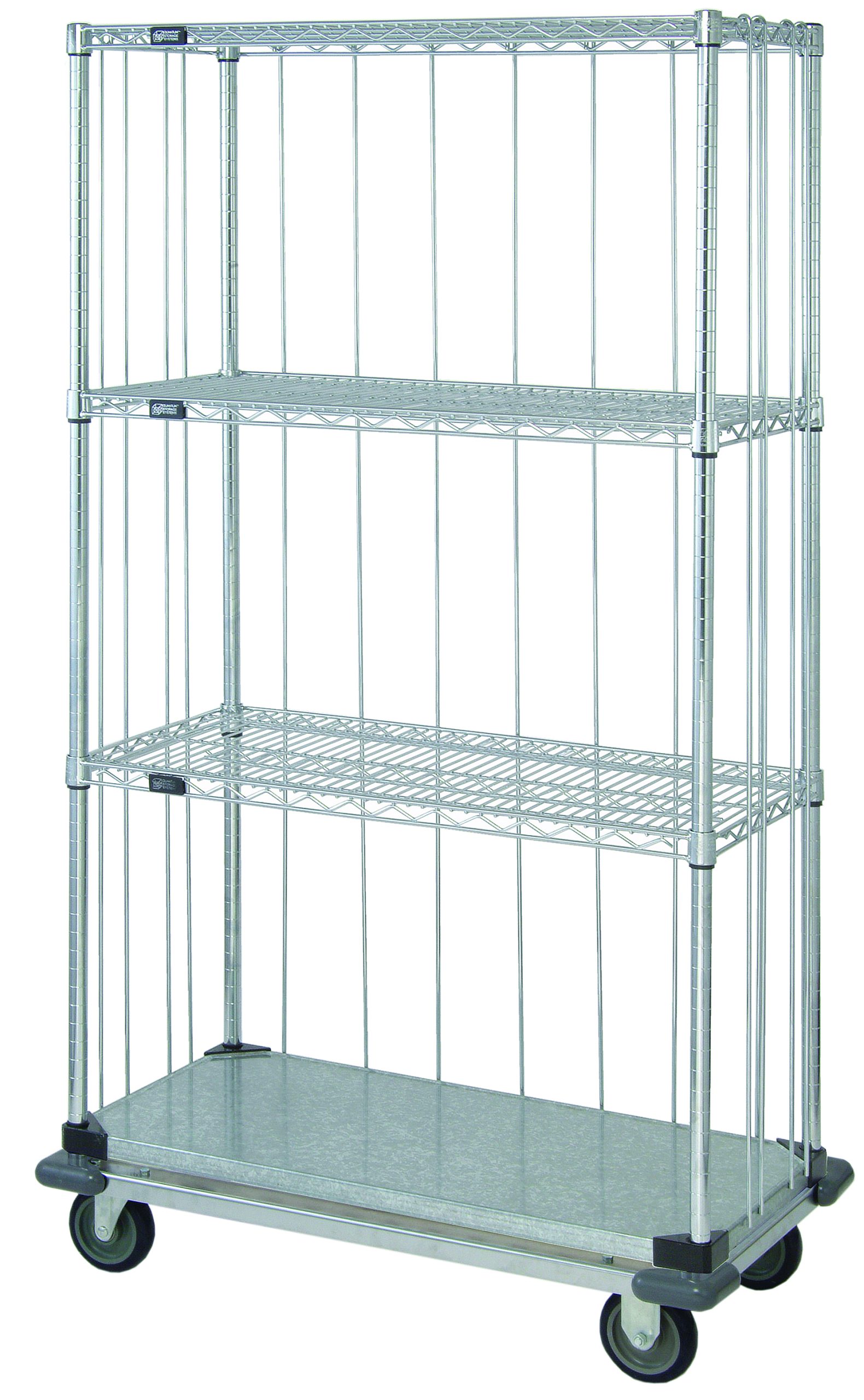 Mobile Enclosure Cart, 36″W x 18″D x 81″H, includes: (3) wire shelves, (1) solid galvanized steel shelf, (4) 74″H posts, rods and tabs kits, (1) dolly base, & (4) plate thermoplastic resin casters (2 rigid, 2 swivel with brakes), chrome plated finish