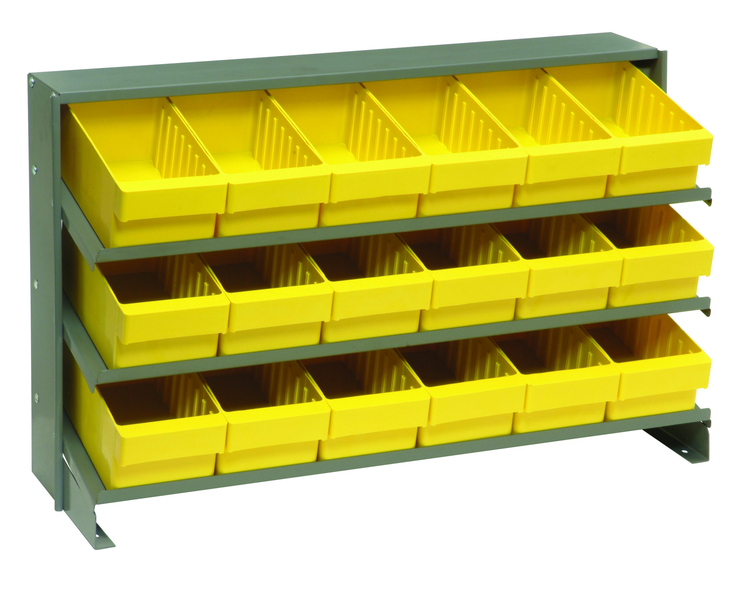 Pick Rack, slopped, bench style, 12-1/2″L x 36″W x 23″H, 250 lbs. capacity, (3) shelves configuration, includes: (18) QED601 yellow bins