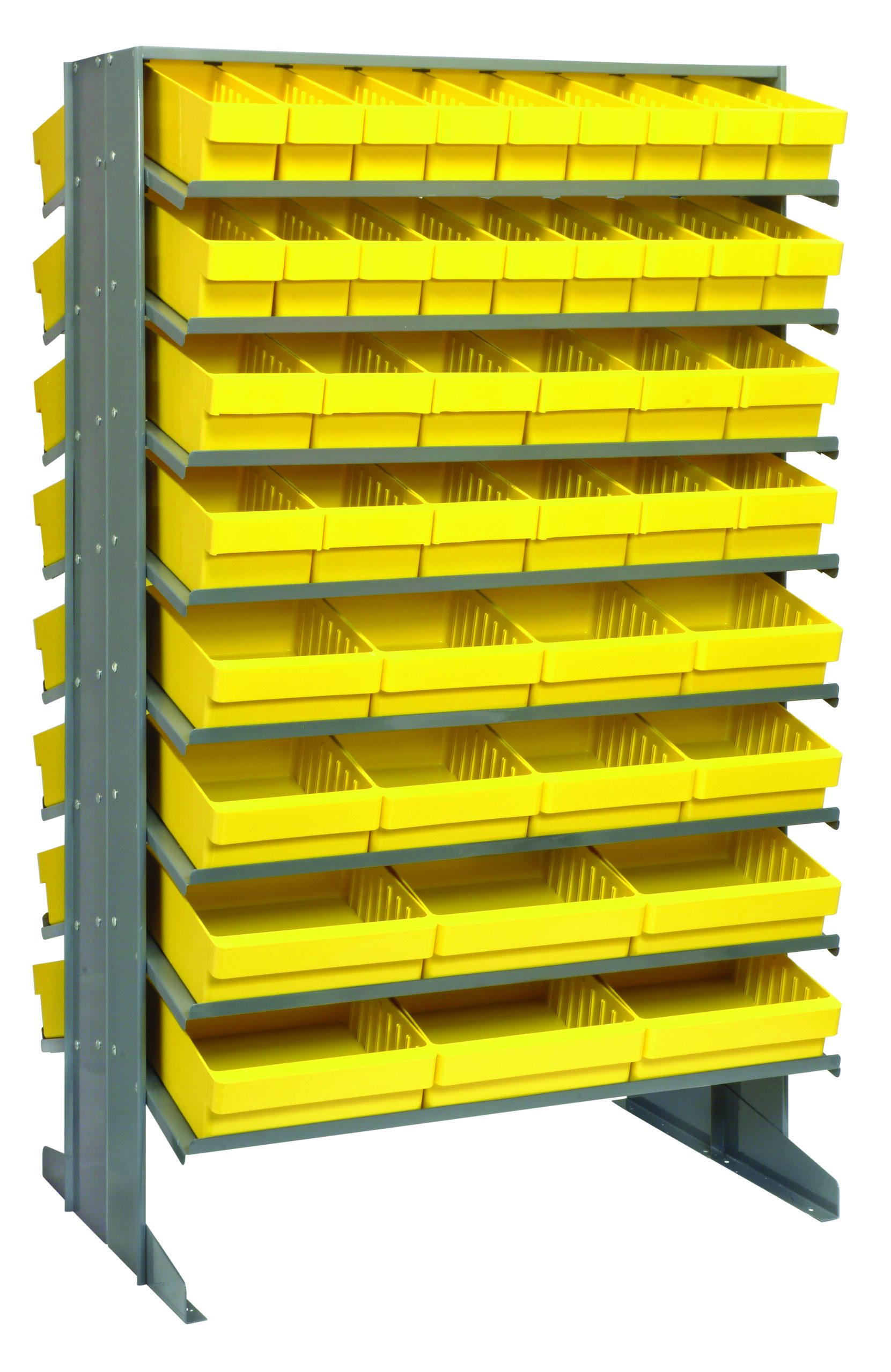 Pick Rack, slopped, double sided, 24″L x 36″W x 60″H, 800 lbs. capacity, (16) shelves configuration, includes: (36) QED501, (24) QED601, (16) QED701 and (12) QED801 yellow bins