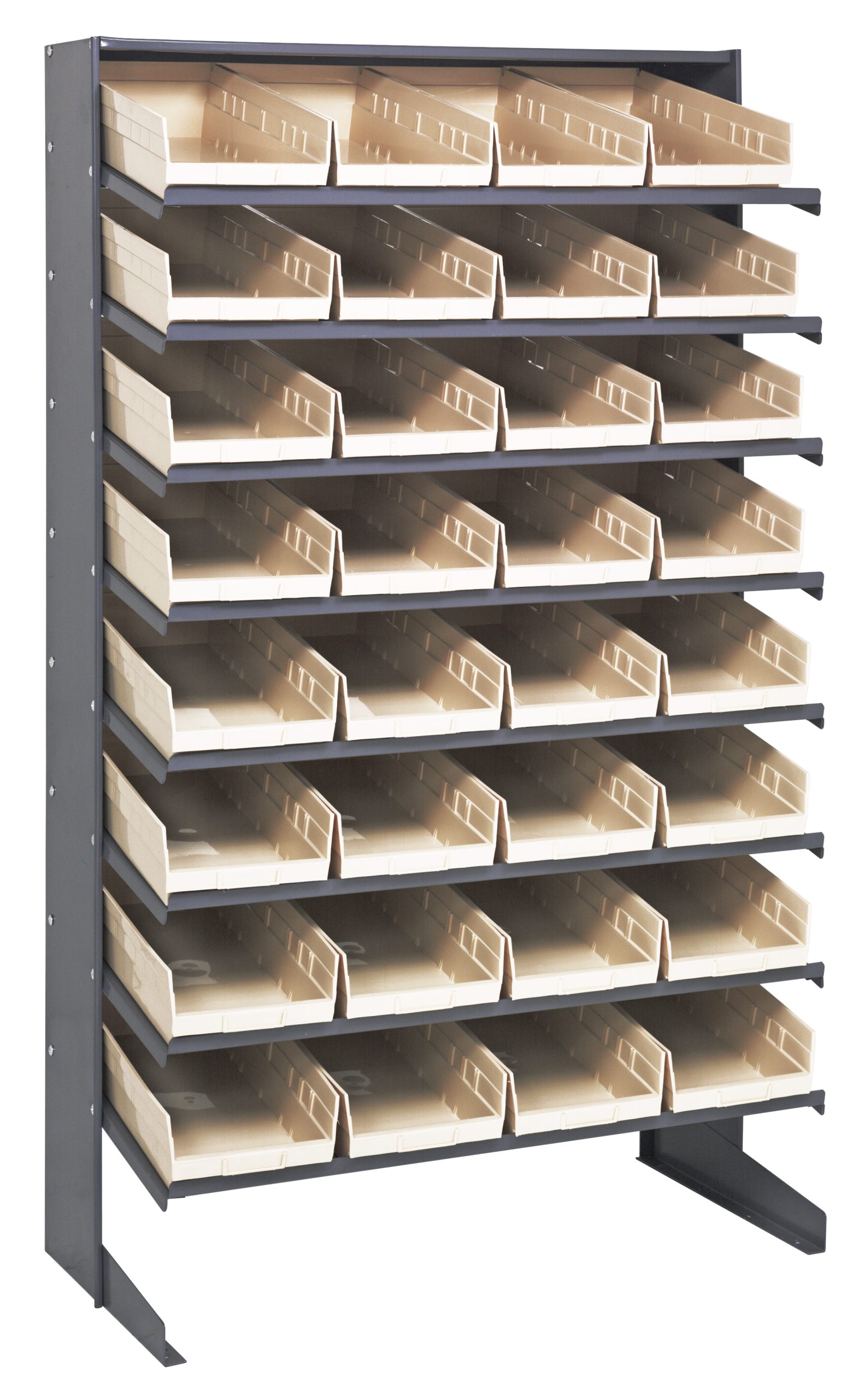 Quantum Pick Rack, Slopped, Single Sided, 18″D X 36″W X 60″H, 400 Lbs. Capacity, Includes: (8) Shelves And (32) Qsb108 Ivory Bins, Galvanized Steel