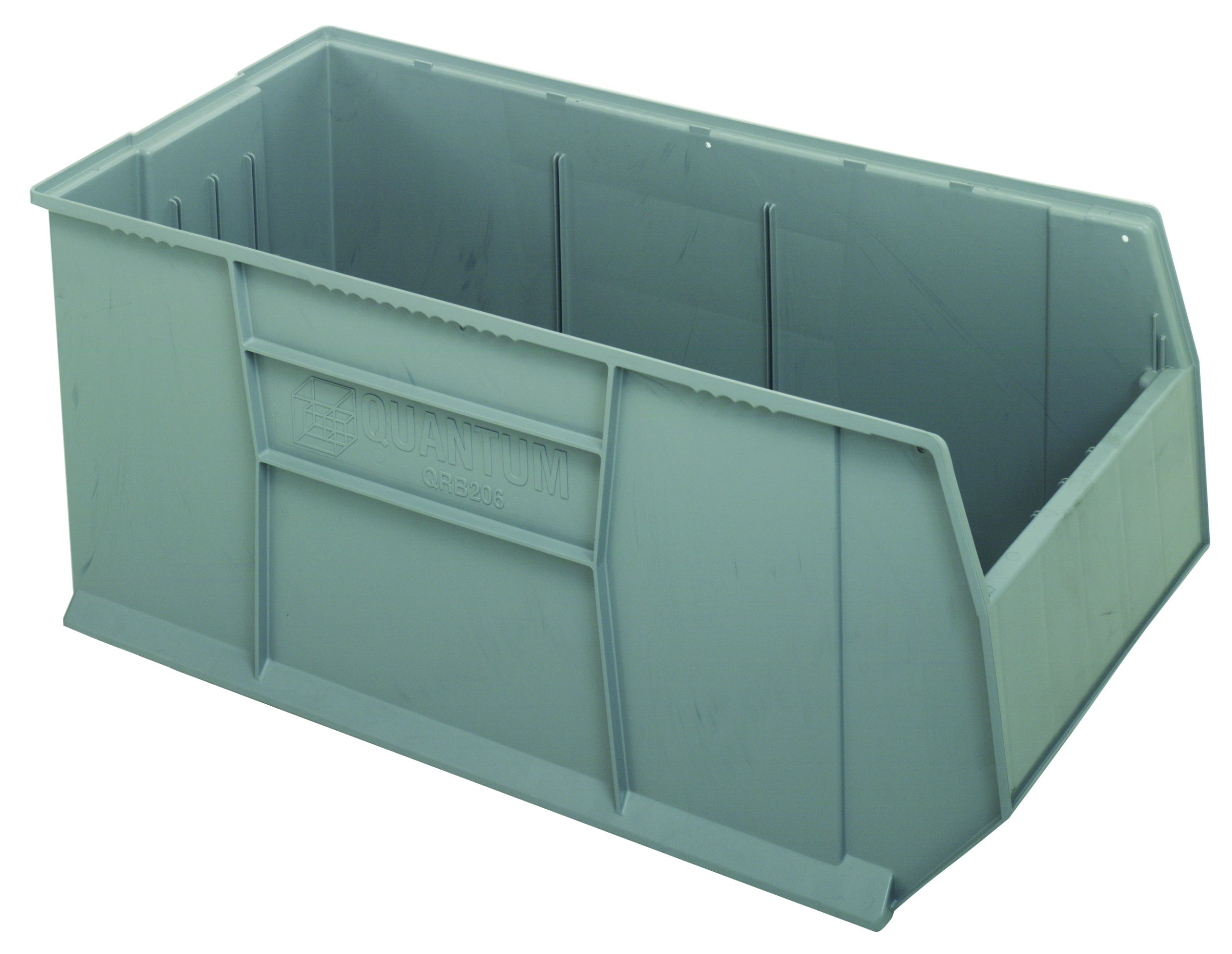 Quantum Rackbin 42″ Container, 47-7/8″L X 19-7/8″W X 17-1/2″H, 180 Lbs. Capacity, Includes (8) 1/4″ Drill Hole Pattern On Bottom Of Bin For Easy Hole Insertion For Drainage And Air Circulation If Needed, Made Of High Density Polypropylene, Gray, Made In USA