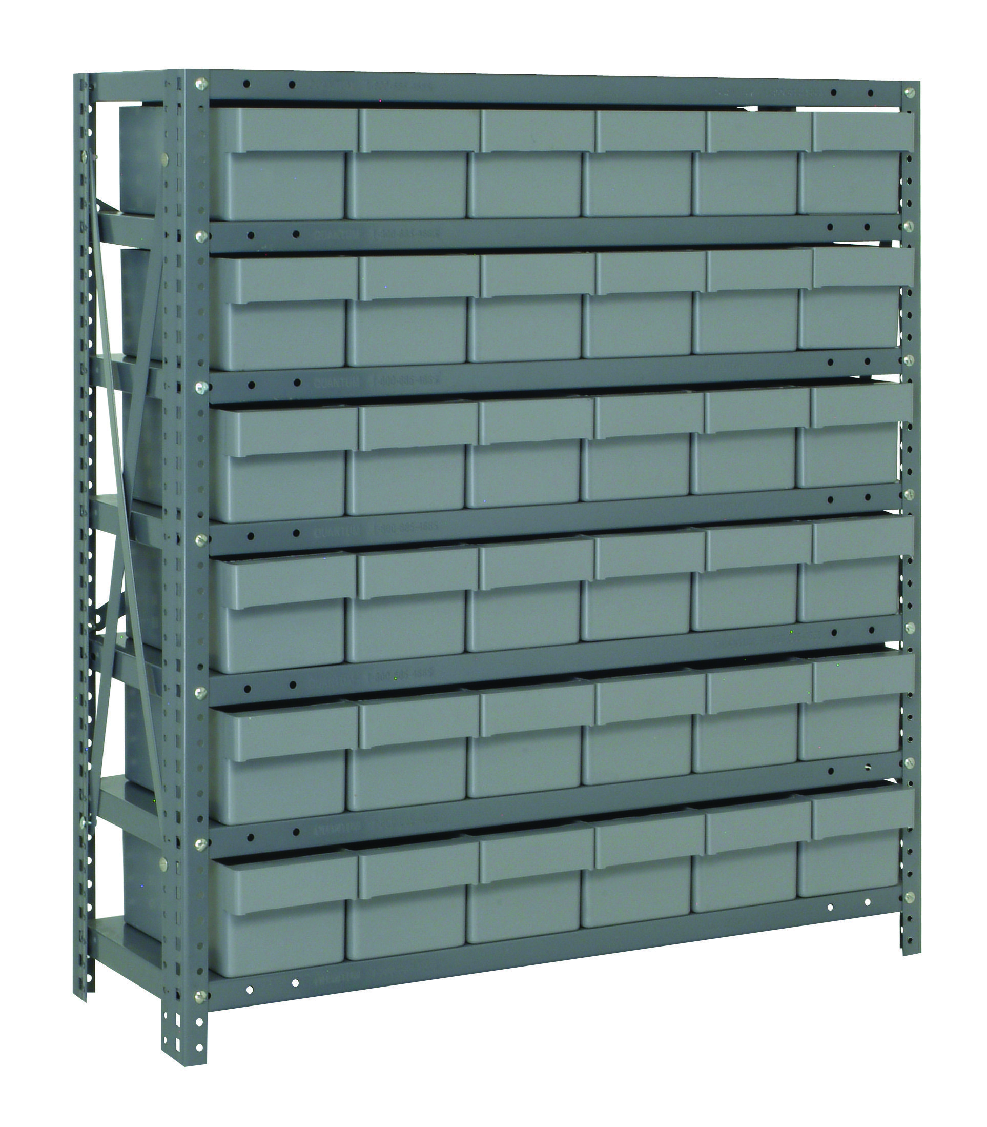 Shelving Unit, 12″D x 36″L x 39″H, heavy duty, 400 lb. load capacity per shelf, includes: (7) shelves, (36) 11-5/8″L x 5-9/16″W x 4-5/8″H (QED601) clear black bins, uprights and cross bars, galvanized steel finish